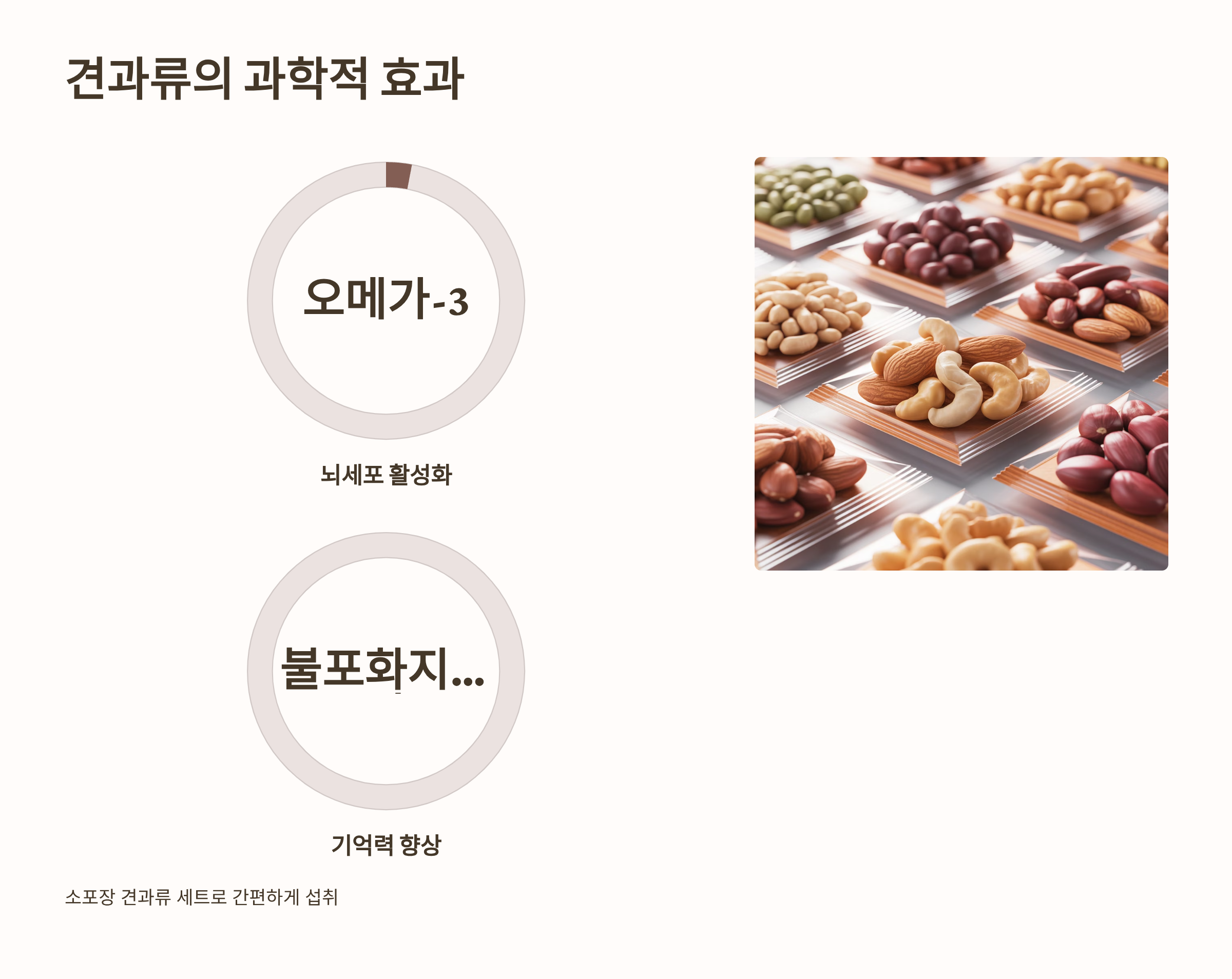 - 브레인 푸드 (오메가-3): 호두, 아몬드, 브라질너트 등 견과류는 오메가-3와 불포화지방산이 풍부하여 뇌세포 활성화와 기억력 향상에 도움을 줍니다. 간편하게 먹을 수 있는 소포장 견과류 세트가 좋습니다.