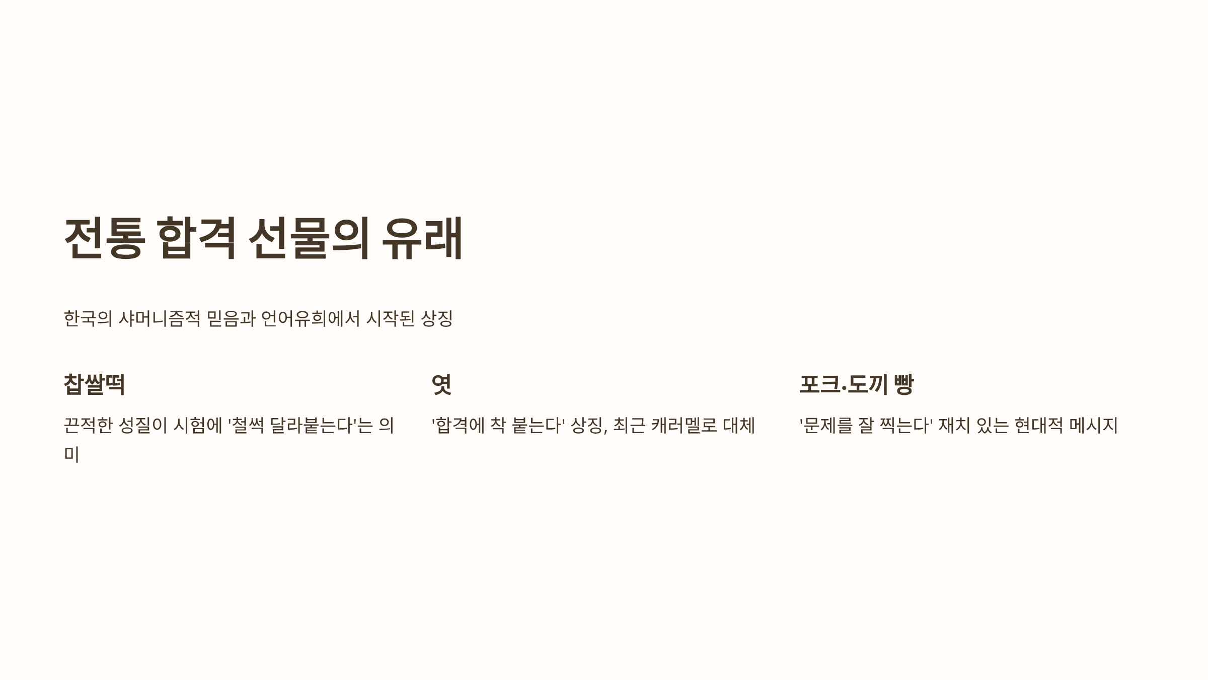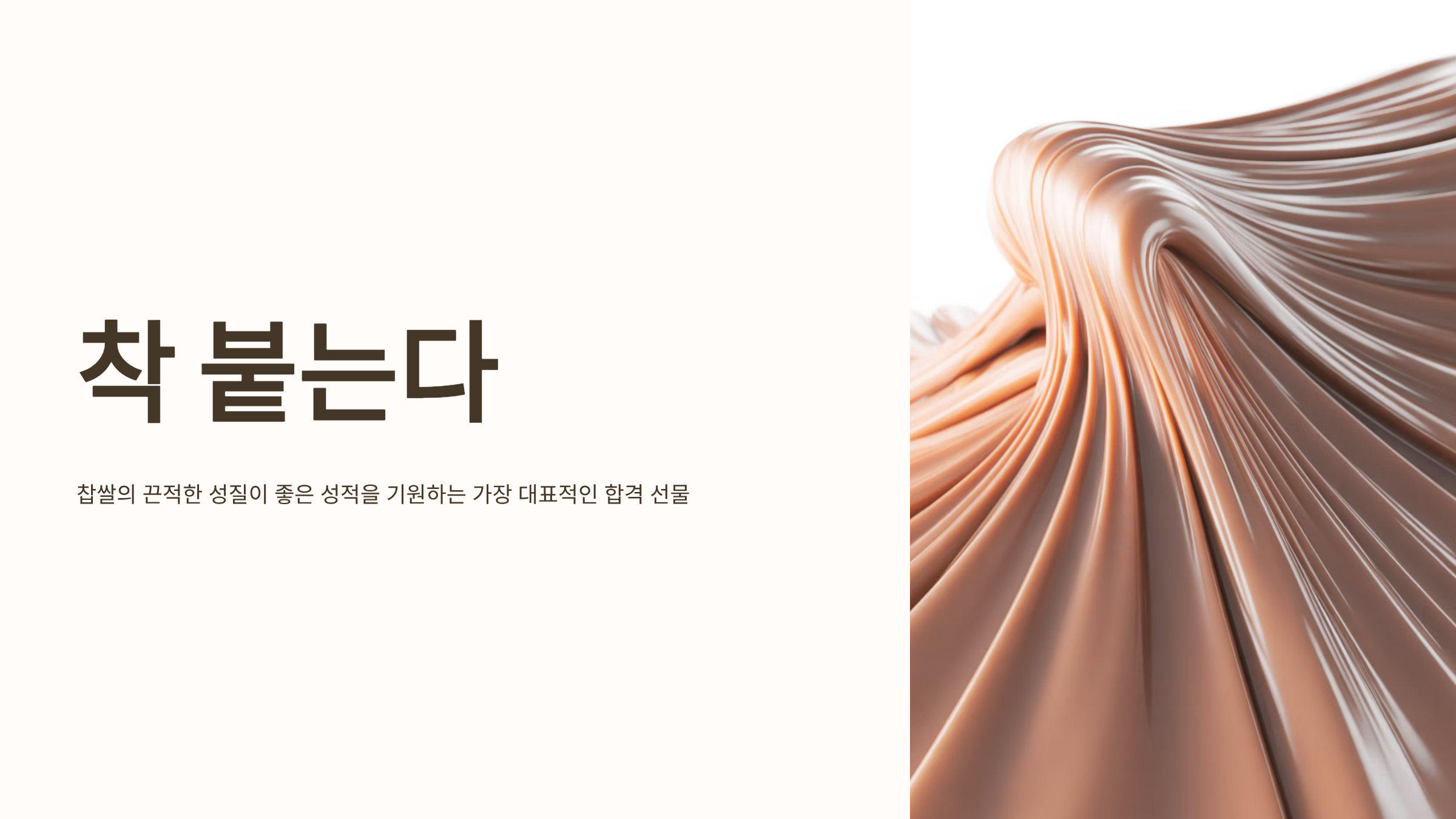 - 찹쌀떡 (잘 붙다): 가장 대표적인 합격 기원 선물입니다. 찹쌀의 끈적한 성질이 시험에 '철썩 달라붙는다'는 의미를 상징하며, 좋은 성적을 기원합니다.