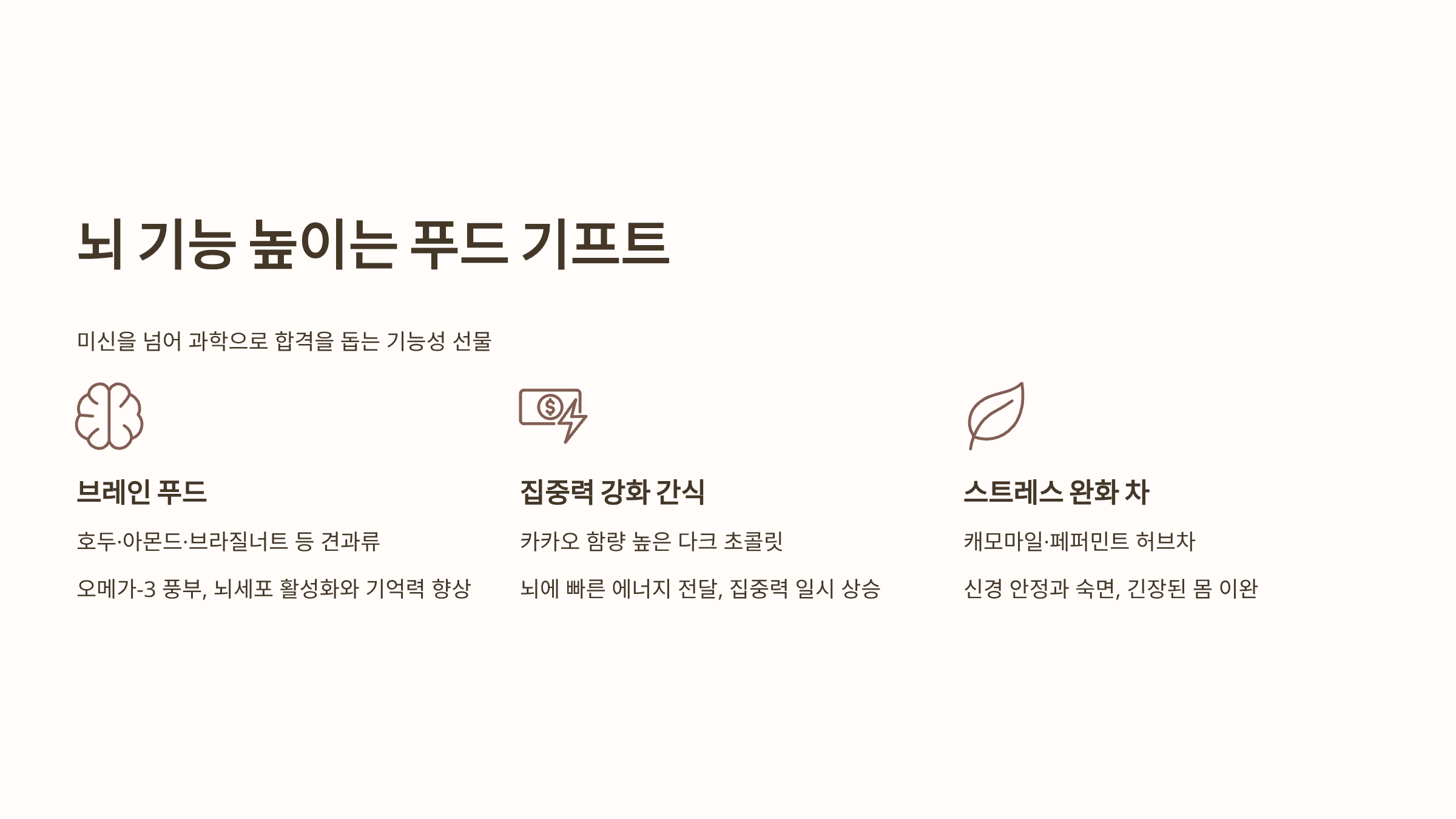 전통적인 합격 기원 푸드 외에도, 뇌 기능 활성화에 과학적으로 도움을 주어 합격에 기여하는 기능성 푸드 기프트를 추천합니다.