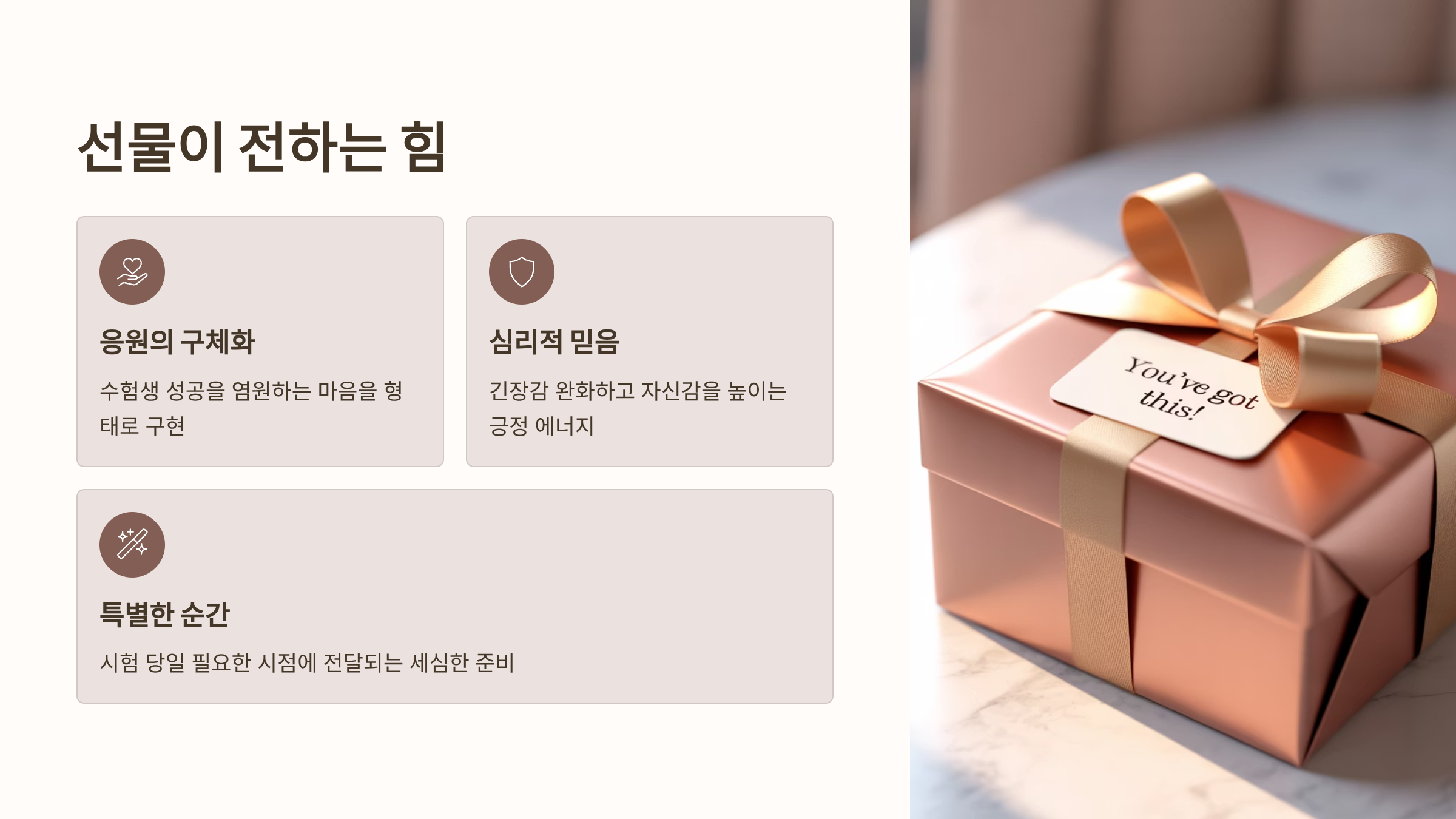 합격 기원 선물은 실제로 수험생의 성적을 올리지는 못하지만, '플라시보 효과'를 통해 심리적 안정감을 극대화하여 실력 발휘를 돕습니다.
