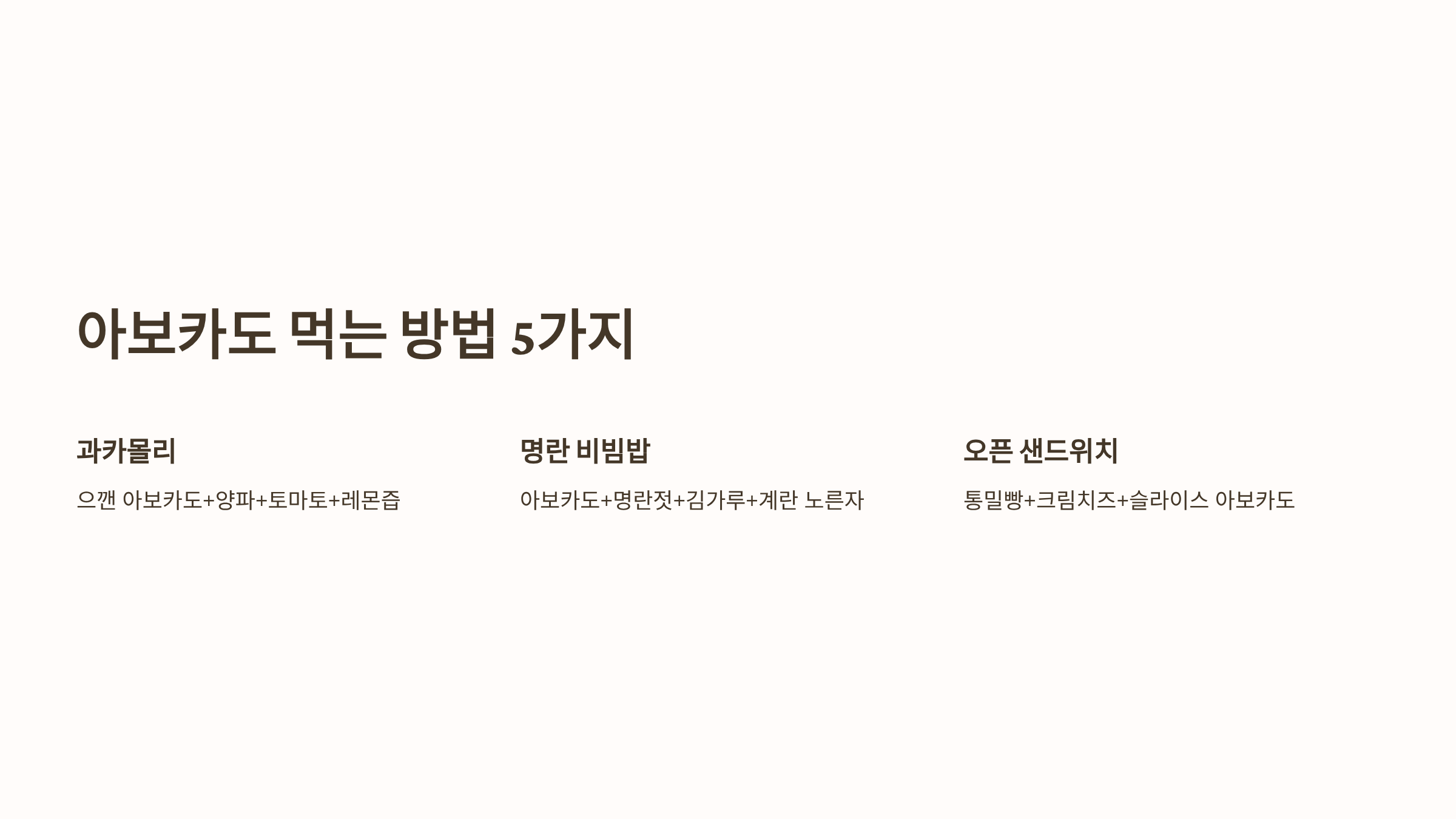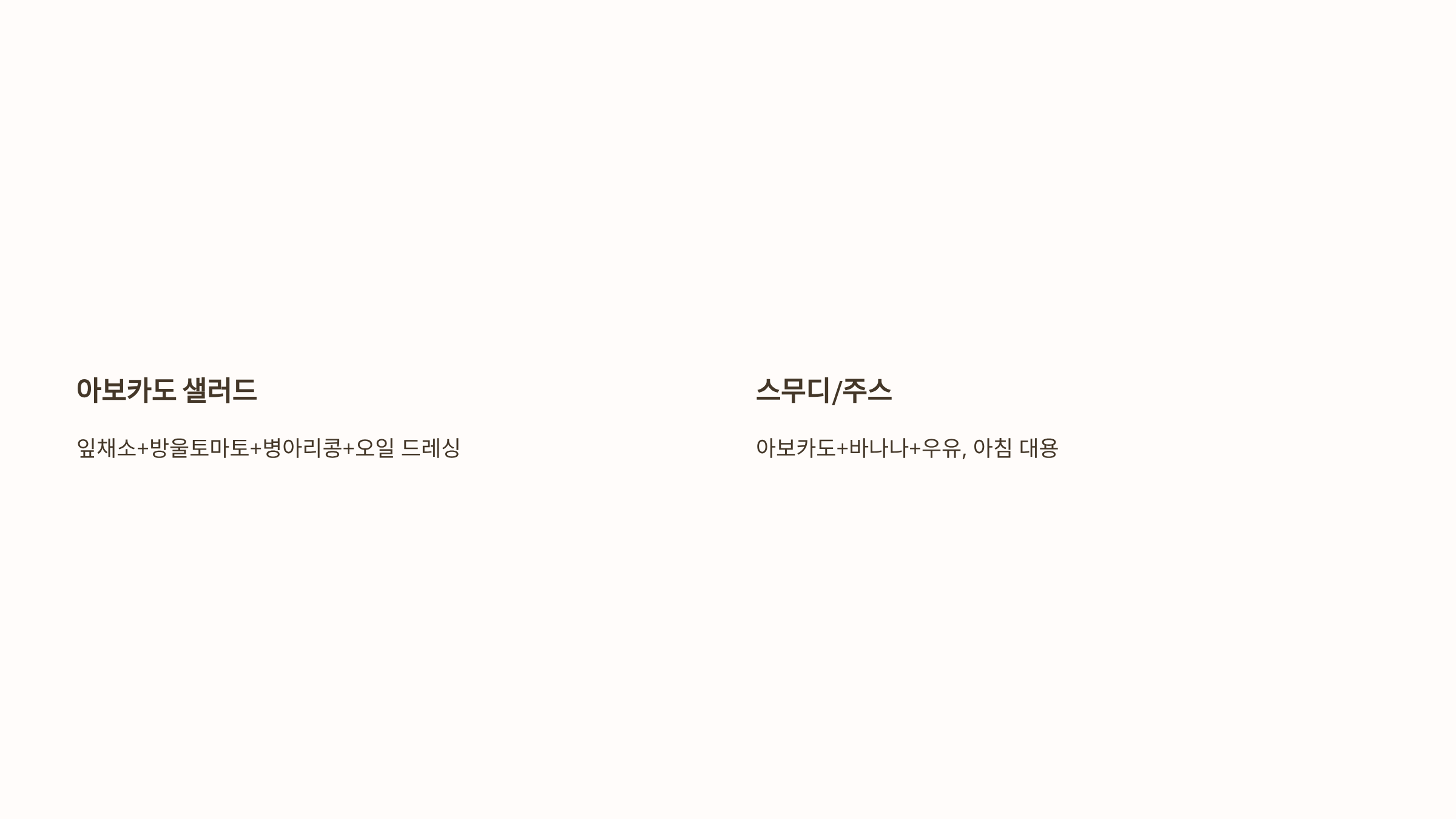 - 아보카도 샐러드: 각종 잎채소와 방울토마토, 병아리콩 등과 함께 큐브 모양으로 썬 아보카도를 섞어 먹습니다. 드레싱은 오일 베이스(올리브 오일+발사믹 식초)가 아보카도의 영양 흡수를 돕습니다.