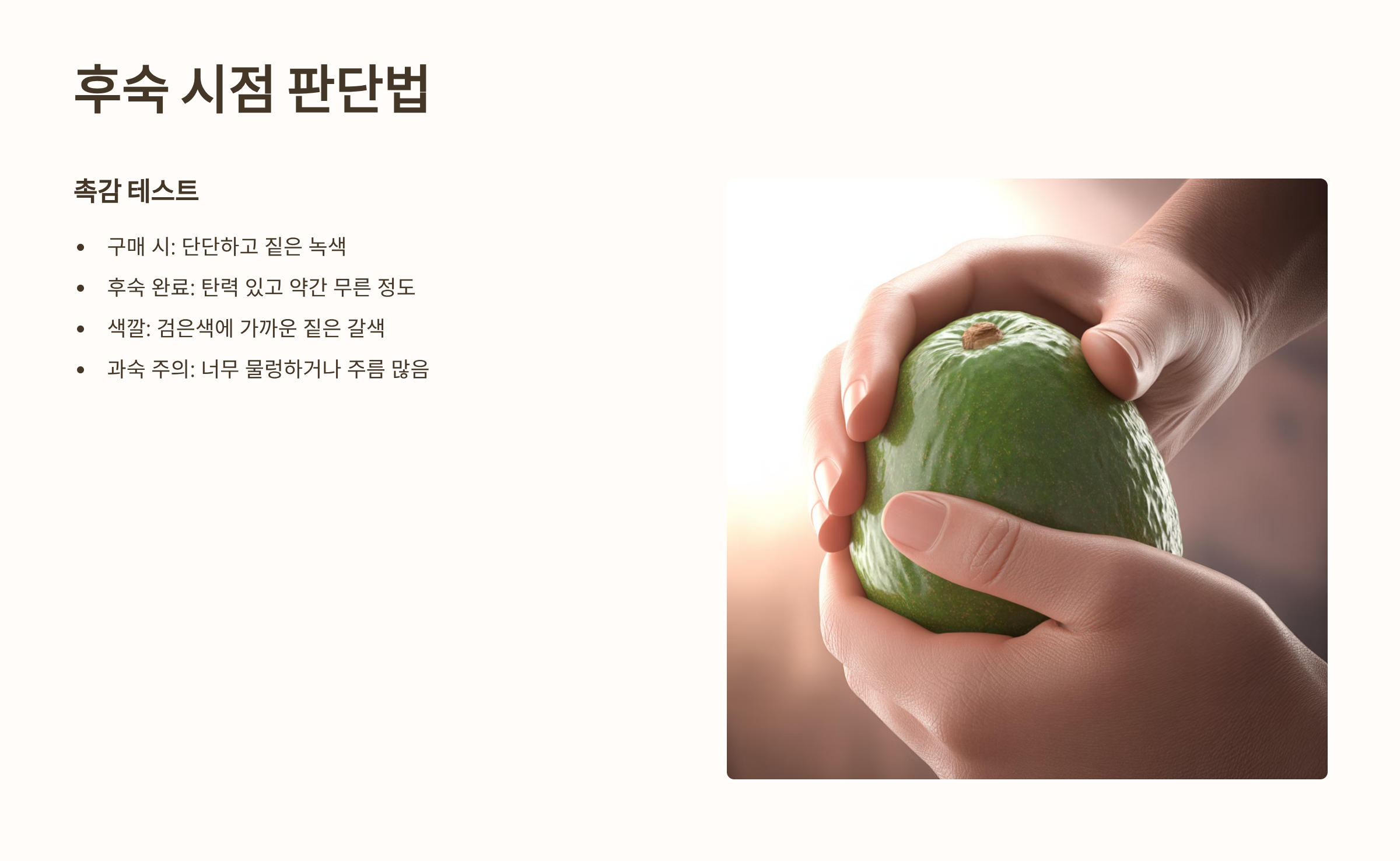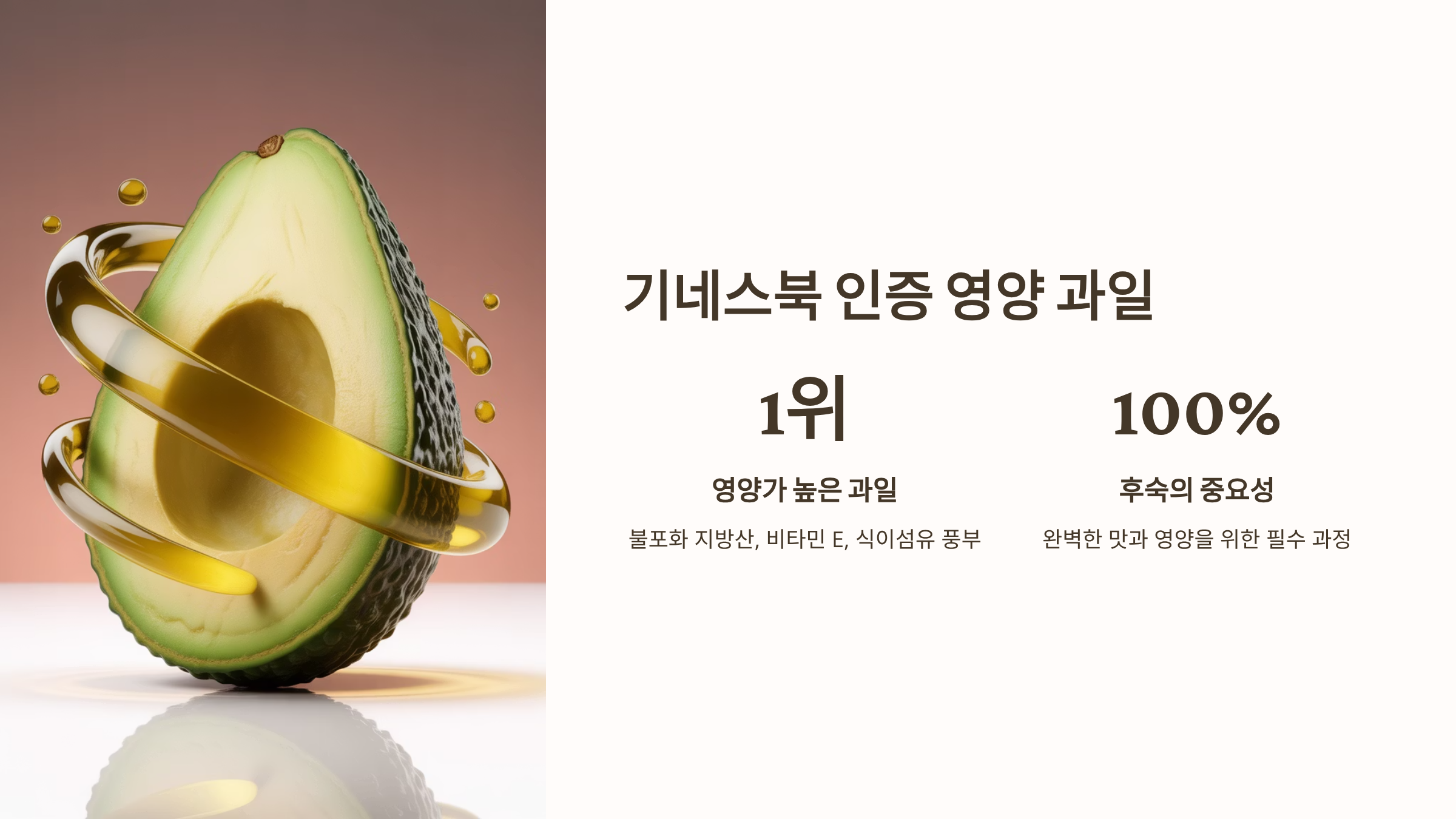 - 후숙의 역할: 단단한 아보카도 속에는 녹말 성분이 많고 떫은맛을 내는 탄닌 성분이 있습니다. 후숙 과정을 통해 녹말이 당분으로 바뀌고, 불포화 지방산이 증가하여 부드러운 버터 같은 식감과 고소한 풍미를 갖게 됩니다.