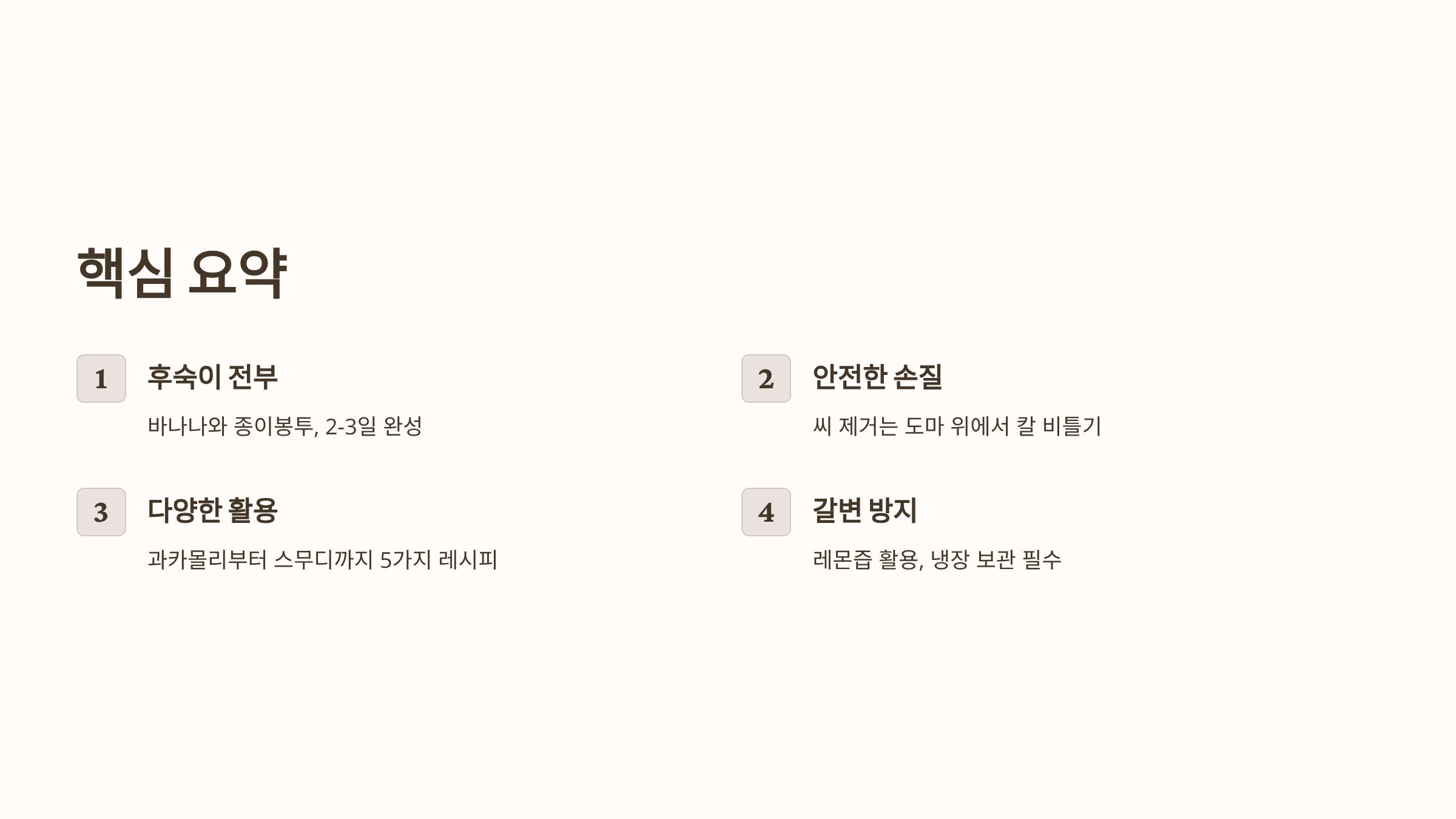 - 후숙 완료: 손으로 살짝 쥐었을 때 탄력이 느껴지면서 약간 무른 정도가 가장 좋습니다. 색깔은 검은색에 가까운 짙은 갈색으로 변합니다.
