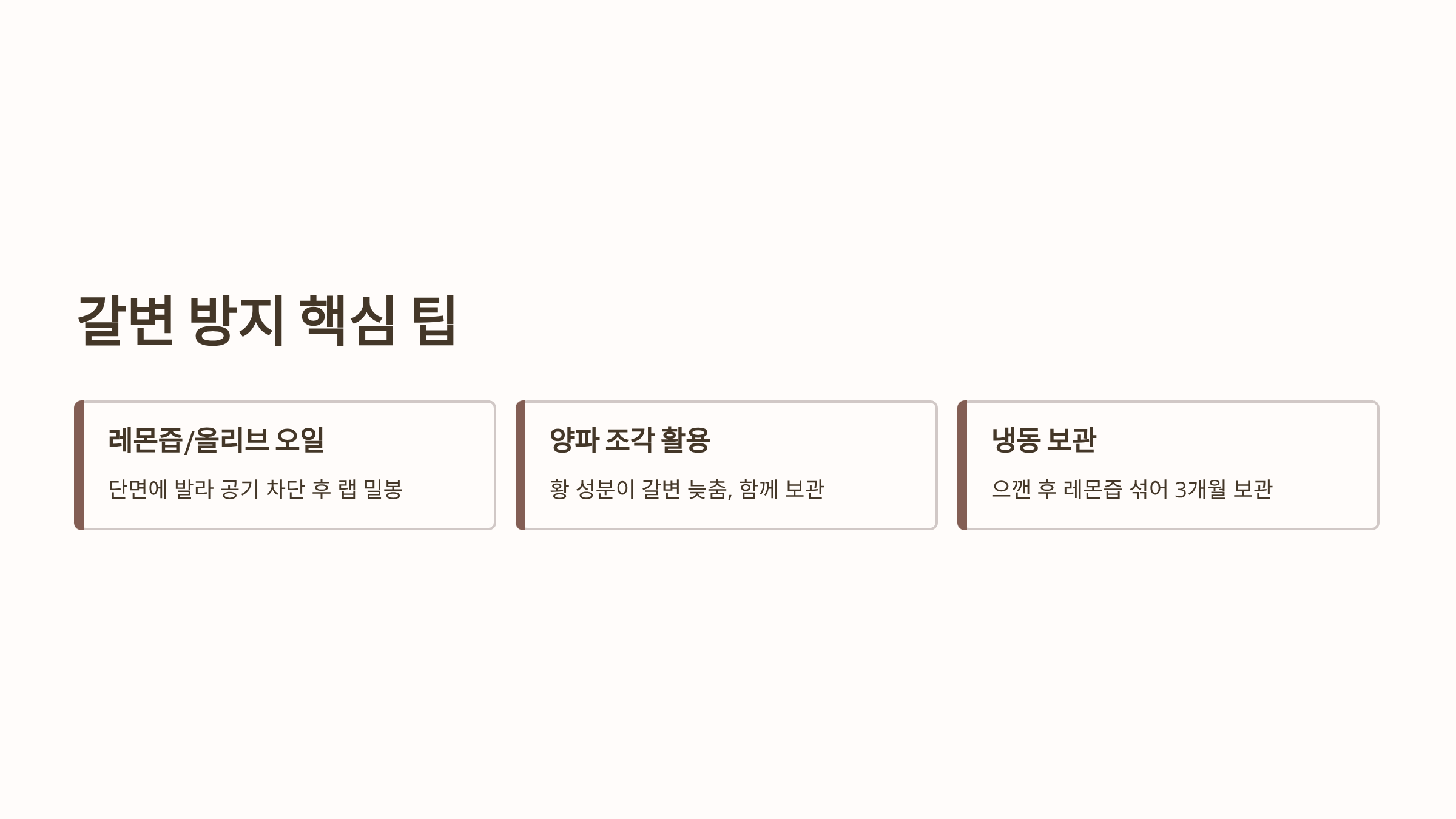 - 레몬즙/올리브 오일: 썰린 단면에 레몬즙이나 올리브 오일을 살짝 발라 공기 접촉을 차단한 후 랩으로 싸서 냉장 보관합니다.