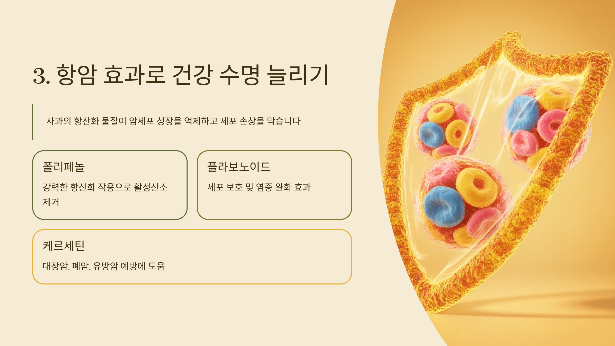 사과의 대표적인 항산화 물질인 폴리페놀과 플라보노이드, 케르세틴은 세포 손상을 막고, 암세포의 생성과 확산을 억제합니다. 특히 사과 껍질에 많은 케르세틴은 폐암과 대장암 예방에 도움을 준다는 연구 결과도 있습니다.