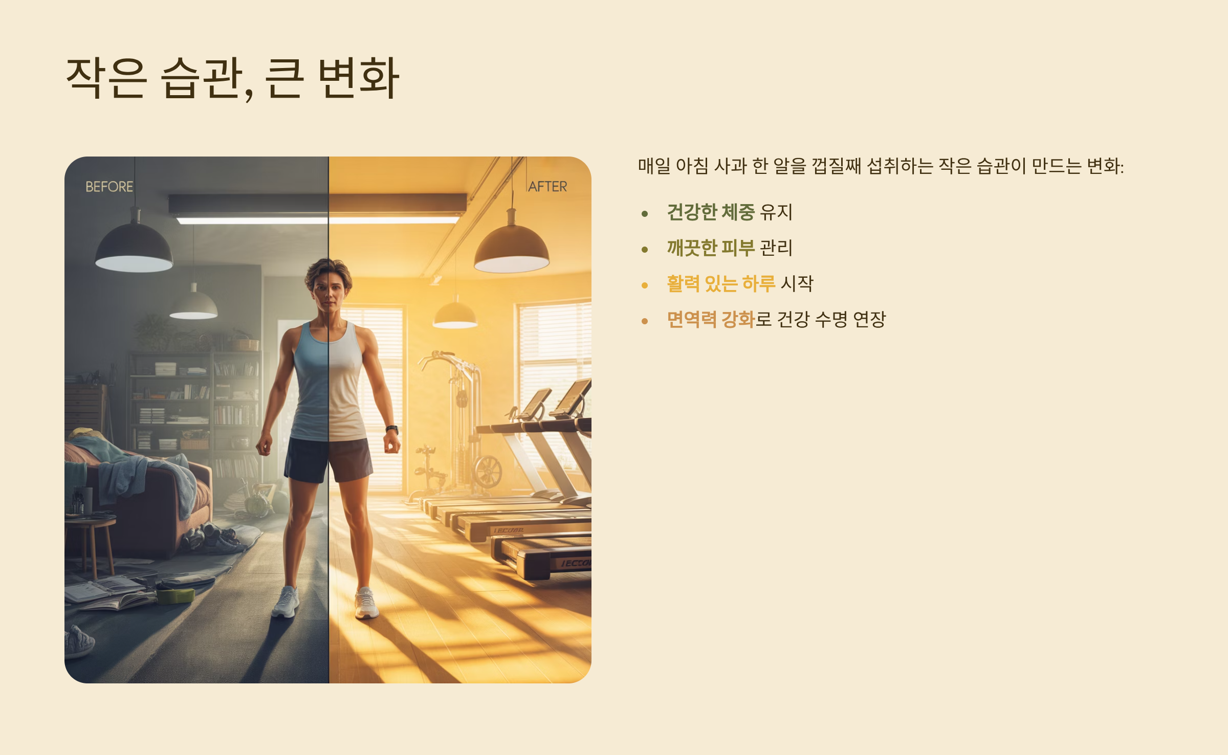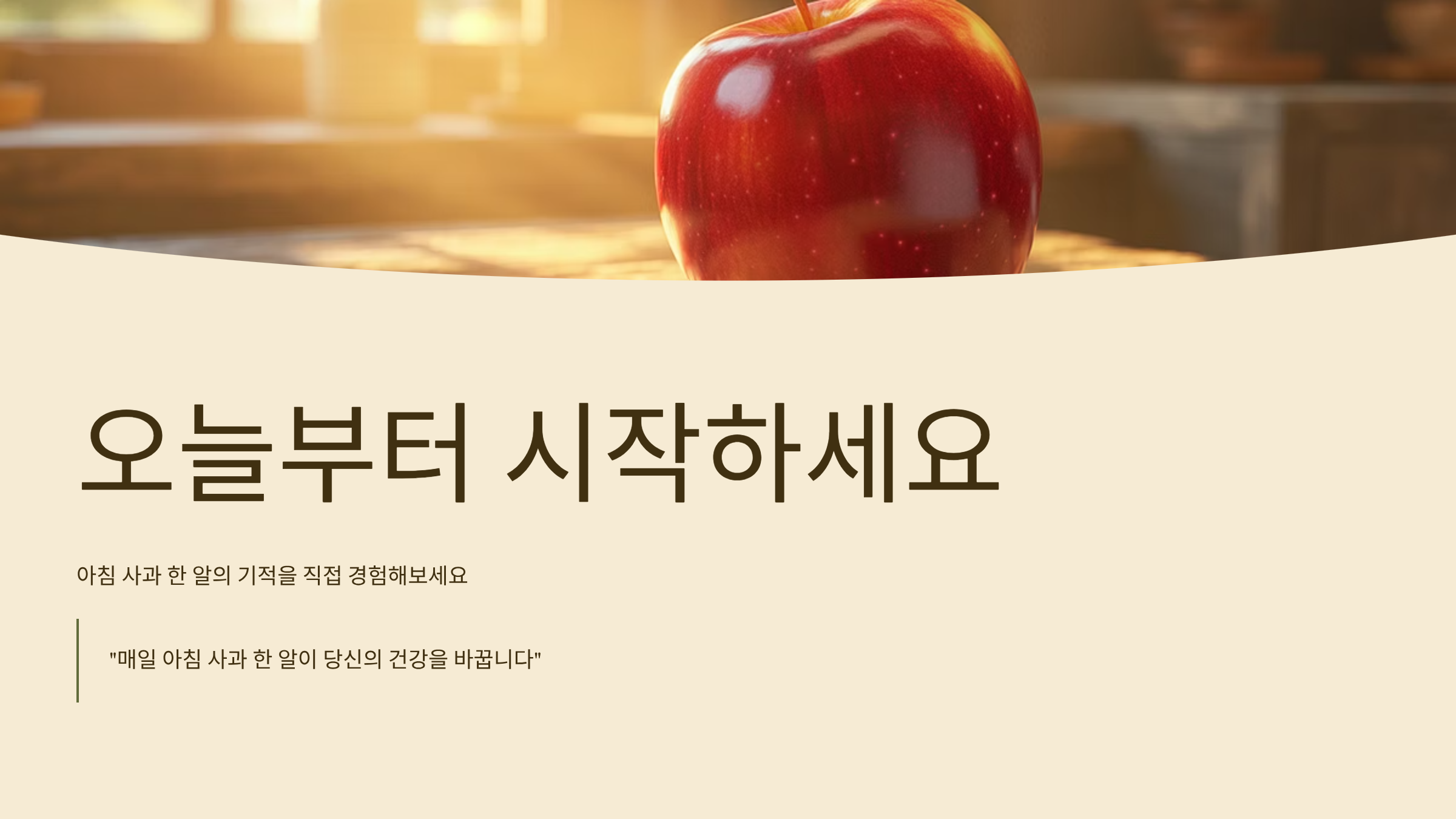 매일 아침 공복에 사과 한 알을 껍질째 먹는 습관은 면역력 향상, 다이어트, 피로 회복, 노화 방지, 혈당 안정까지 모두 챙길 수 있는 최고의 건강 루틴입니다. 바쁜 현대인일수록 커피 한 잔 대신 ‘아침 사과 한 알’로 하루를 시작해 보세요.