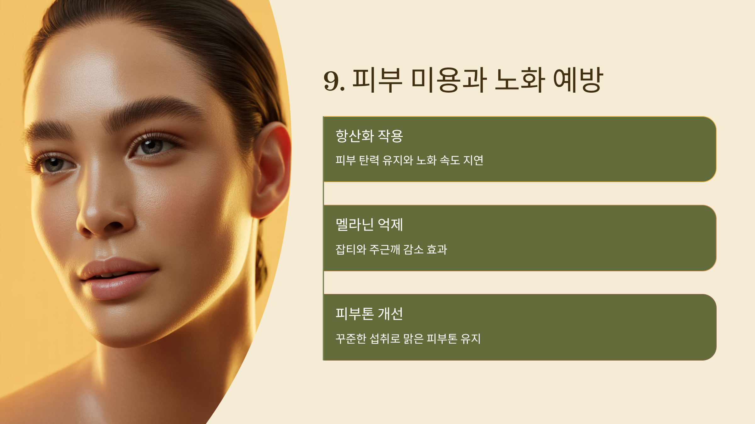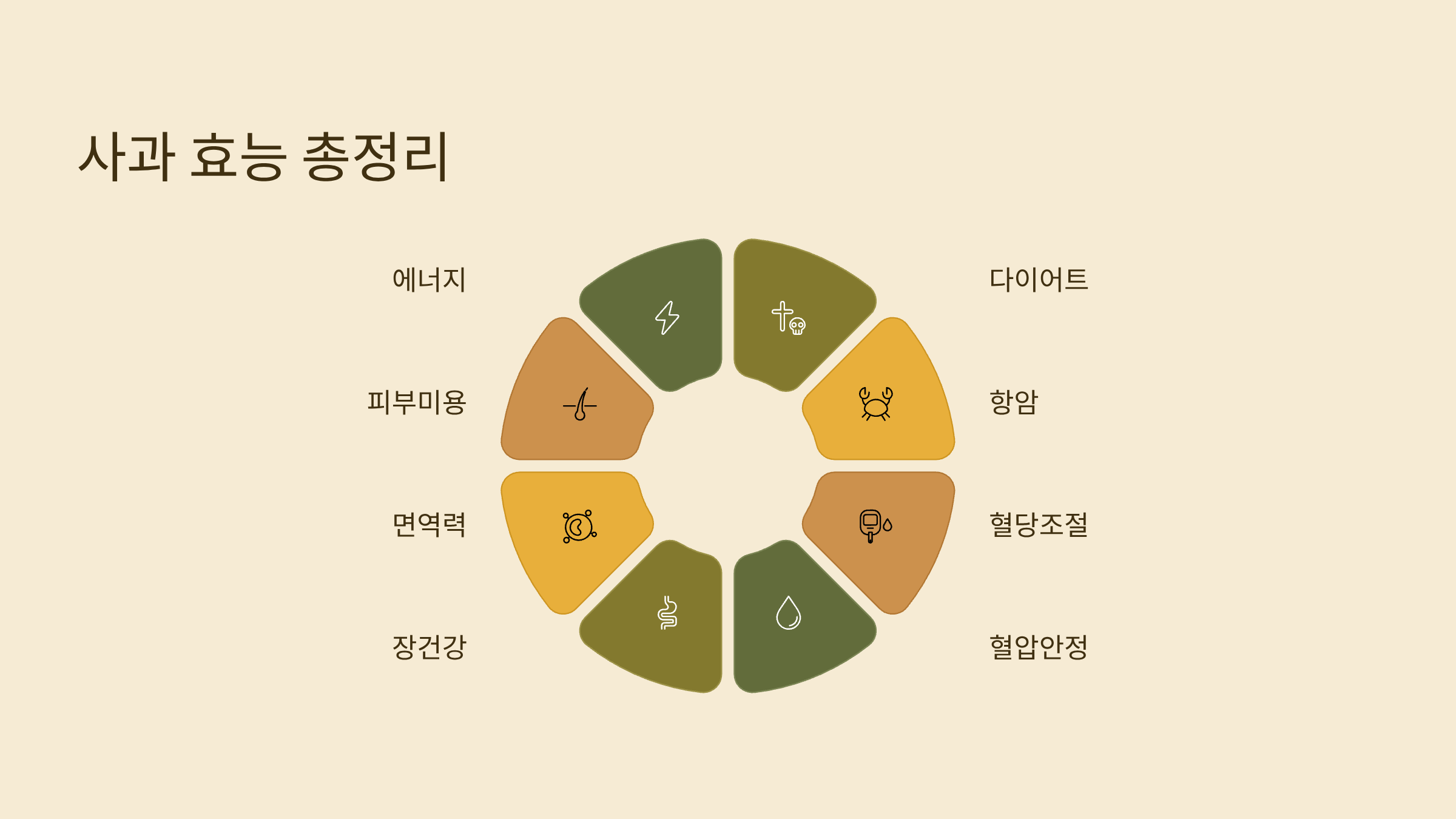 사과는 비타민 C와 플라보노이드가 풍부해 피부 속 멜라닌 생성을 억제하고, 주근깨와 기미를 완화합니다. 또한 항산화 작용이 활성산소로 인한 피부 노화를 막아주어 피부결을 부드럽게 유지합니다.