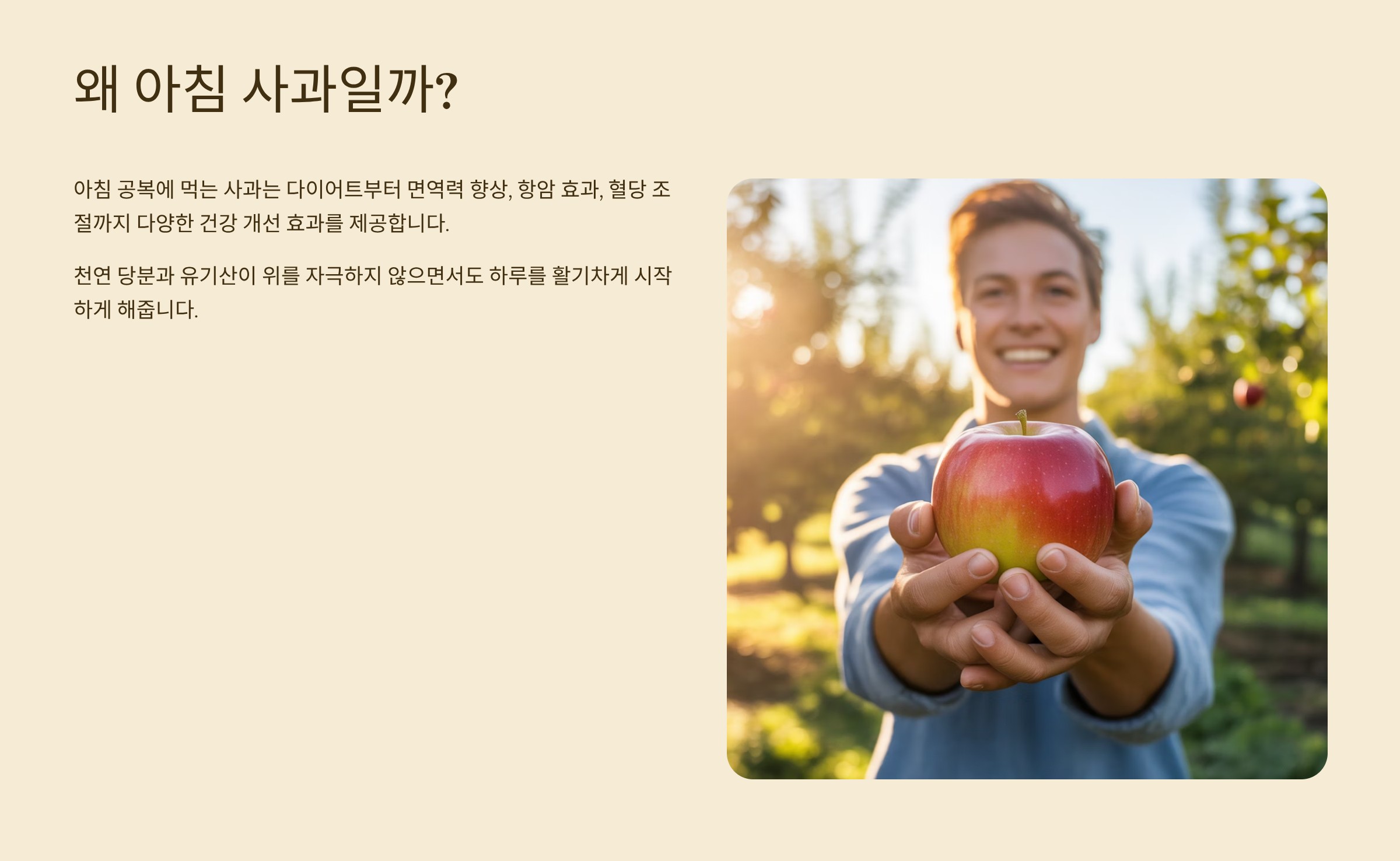 아침 사과 효능은 단순한 비타민 섭취 그 이상입니다. 사과는 인체의 대사를 활성화시키고, 장을 깨끗하게 하며, 심혈관 건강과 피부 미용까지 관리해주는 완벽한 과일입니다.