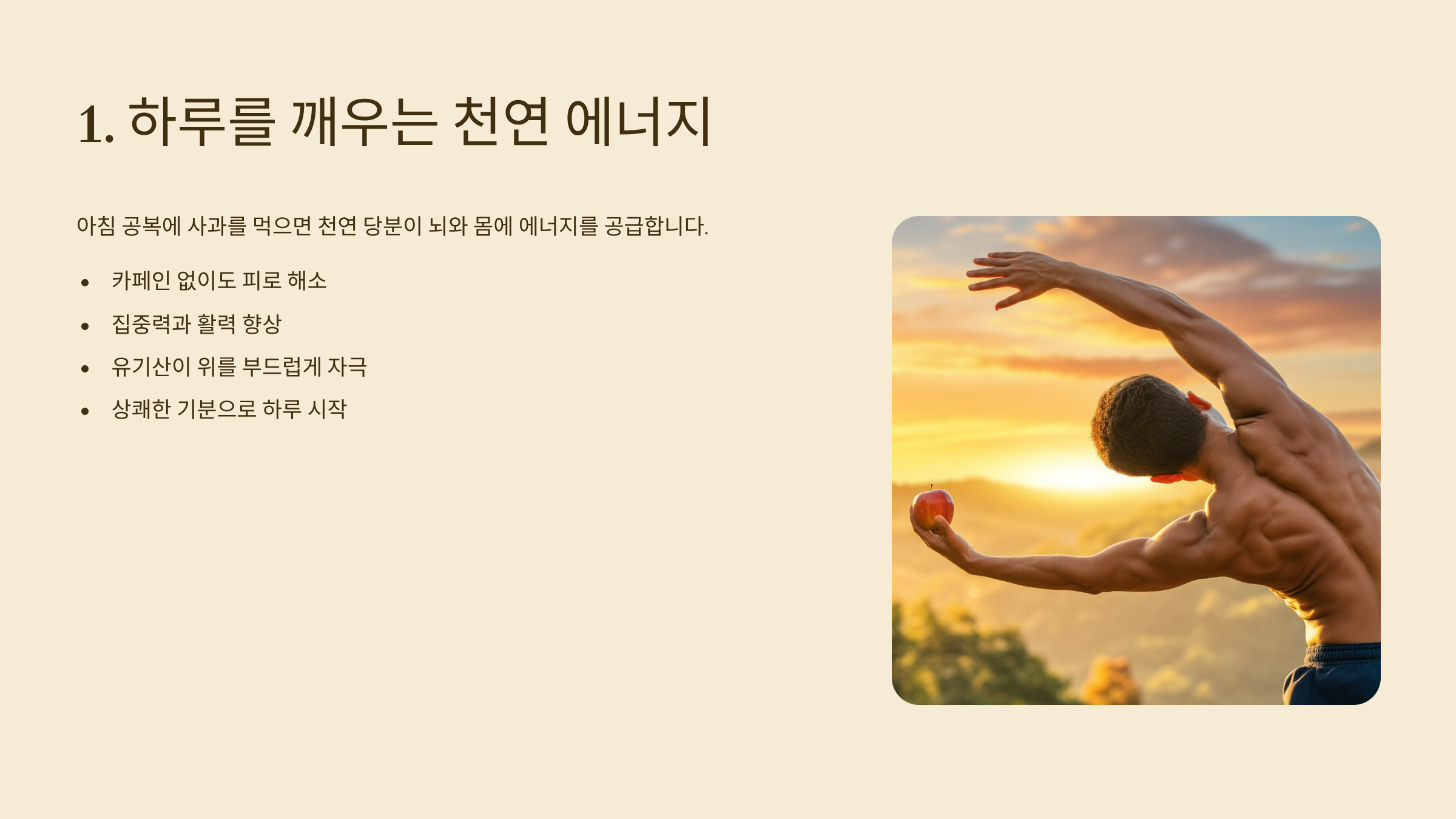 아침 공복 상태에서는 혈당이 낮아져 피로감이 생기기 쉽습니다. 이때 사과에 들어 있는 천연 당분인 과당과 포도당이 빠르게 에너지를 보충해줍니다. 커피를 마시기 전 사과 한 입만으로도 잠이 깨고 두뇌가 맑아지는 효과를 느낄 수 있습니다.