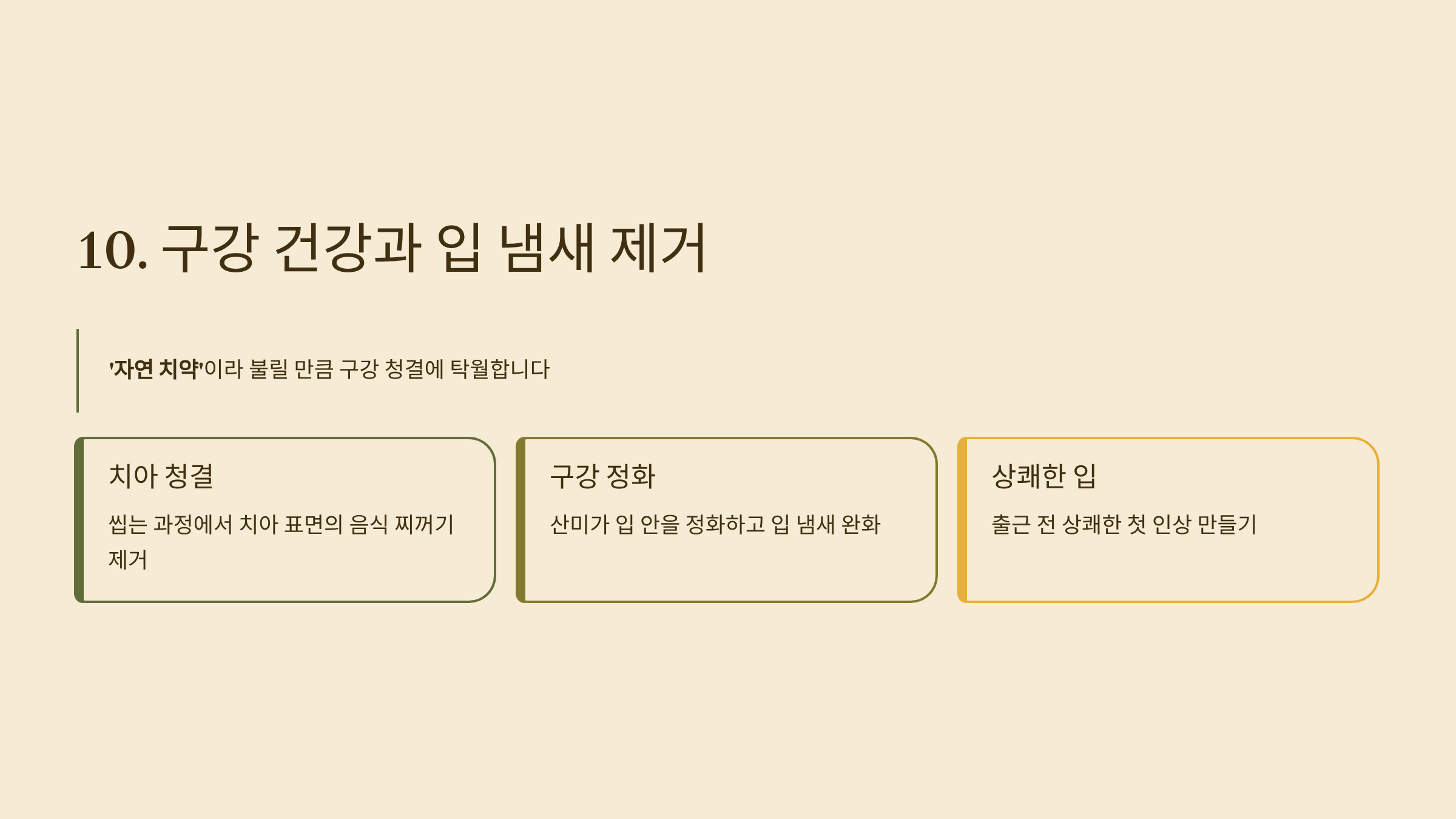 사과는 섬유질이 풍부해 씹는 동안 자연스럽게 치아 표면의 플라크를 제거하고, 사과산이 구강 내 세균을 억제합니다. 입 냄새를 개선할 뿐 아니라 침 분비를 늘려 구강 건조증 예방에도 도움을 줍니다.