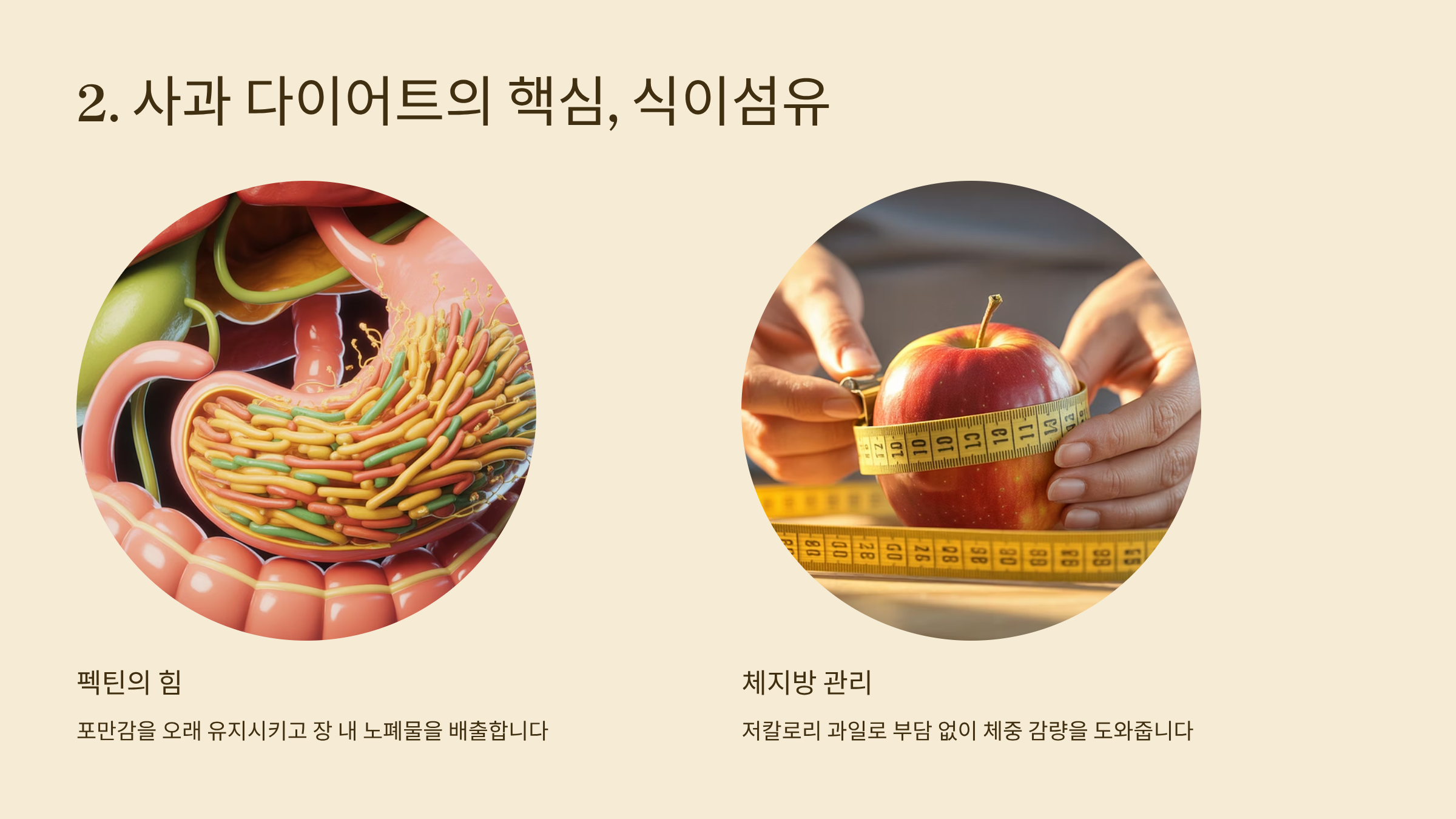 사과 다이어트는 꾸준히 실천할 수 있는 가장 간단한 방법입니다. 사과 속 펙틴이 위에서 팽창하며 포만감을 오래 유지시키고, 지방 흡수를 억제합니다. 또한 식이섬유가 장을 부드럽게 자극해 배변 활동을 원활하게 해주기 때문에 독소 배출 효과도 뛰어납니다.