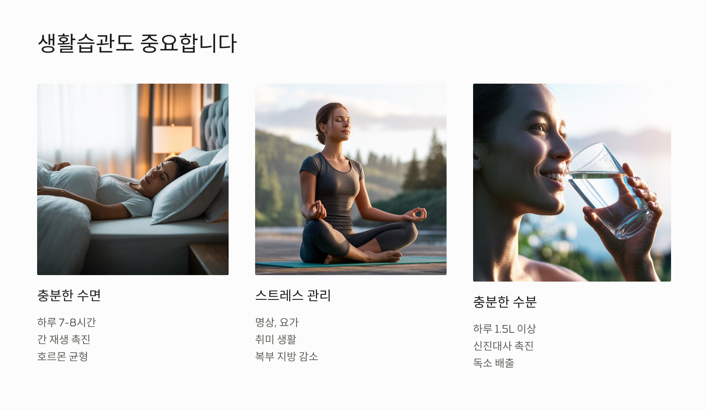 충분한 수면도 중요합니다. 하루 7-8시간의 질 좋은 수면은 호르몬 균형을 맞춰주고 간 재생을 돕습니다. 수면 부족은 식욕 조절 호르몬을 교란시켜 과식을 유발할 수 있습니다.