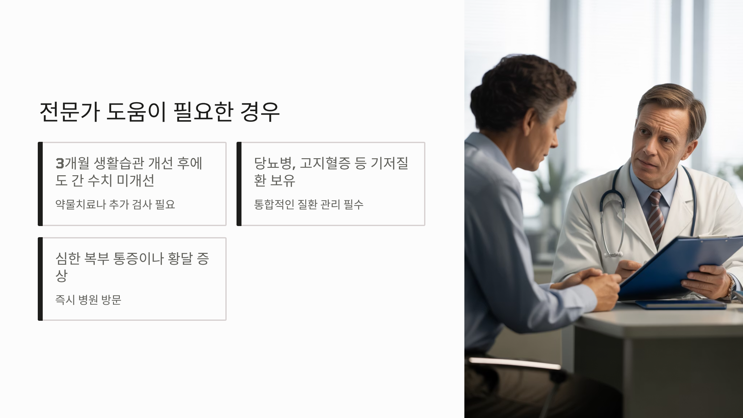 만약 3개월간 생활습관을 개선했는데도 간 수치가 호전되지 않는다면, 반드시 전문의와 상담하여 약물치료나 추가 검사를 받아보셔야 합니다. 당뇨병, 고지혈증 등 기저질환이 있다면 해당 질환의 관리도 함께 이뤄져야 지방간 개선이 가능합니다.