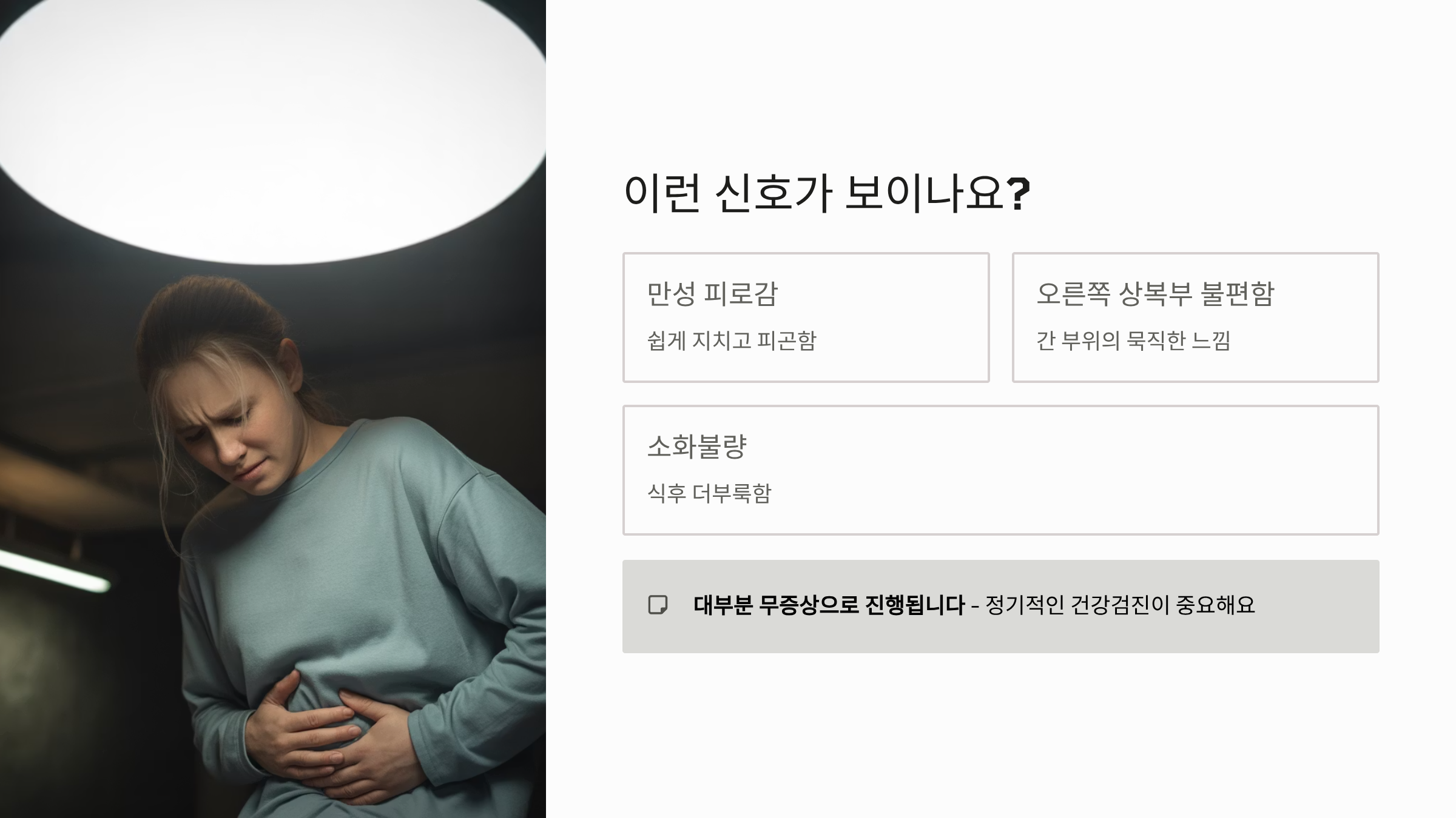 지방간의 위험 신호로는 만성 피로감, 오른쪽 상복부 불편함, 소화불량 등이 있지만, 대부분 무증상으로 진행되기 때문에 정기적인 건강검진이 중요합니다. 혈액검사에서 AST, ALT 수치가 상승하거나 초음파 검사에서 간의 에코가 증가했다면 지방간을 의심해볼 수 있습니다.