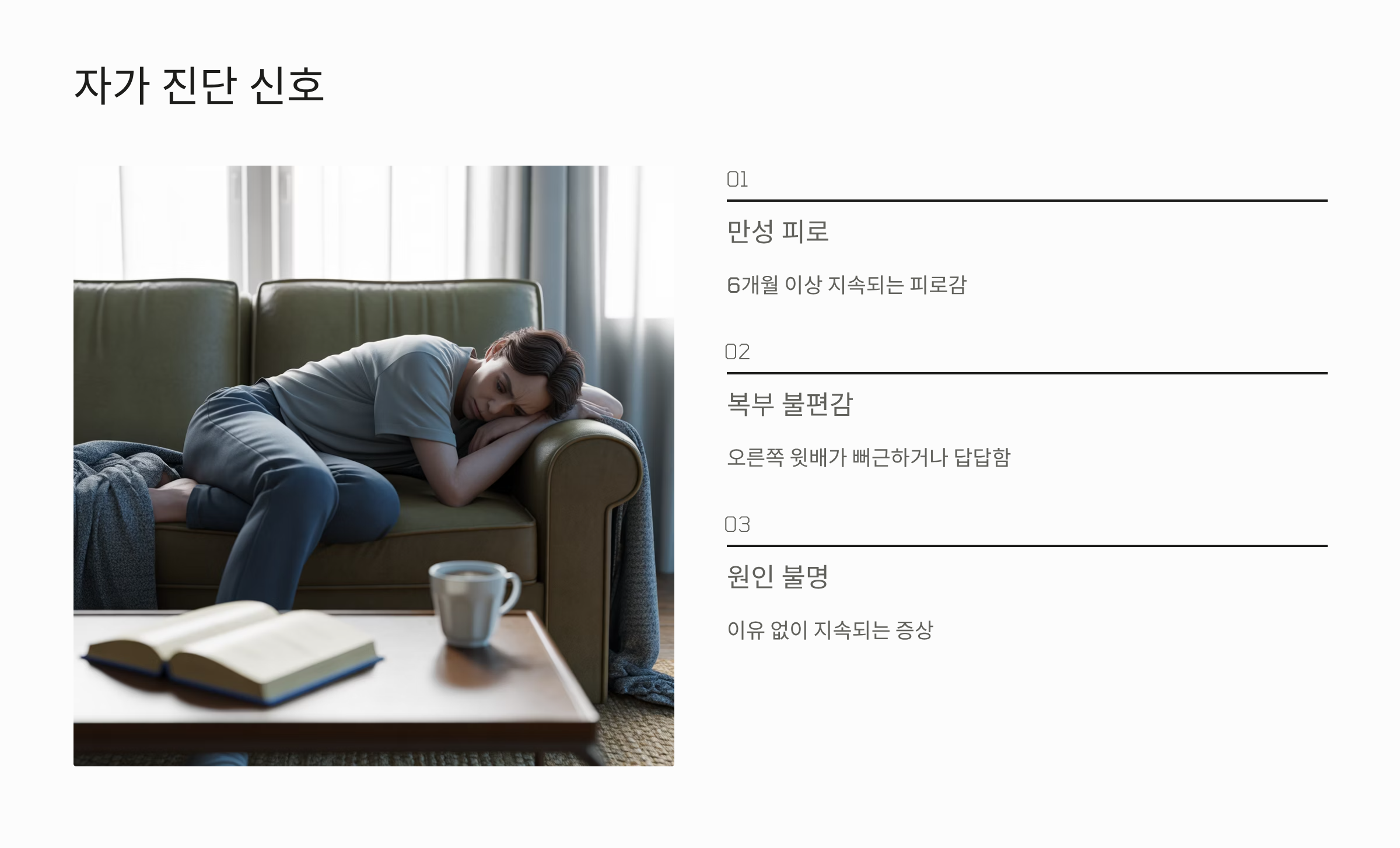 - 자가 진단 신호: 만성적인 피로감이 6개월 이상 지속되거나, 평소보다 이유 없이 오른쪽 윗배(늑골 아래)가 뻐근하거나 답답한 느낌이 든다면 지방간 증상을 의심해 볼 필요가 있습니다.