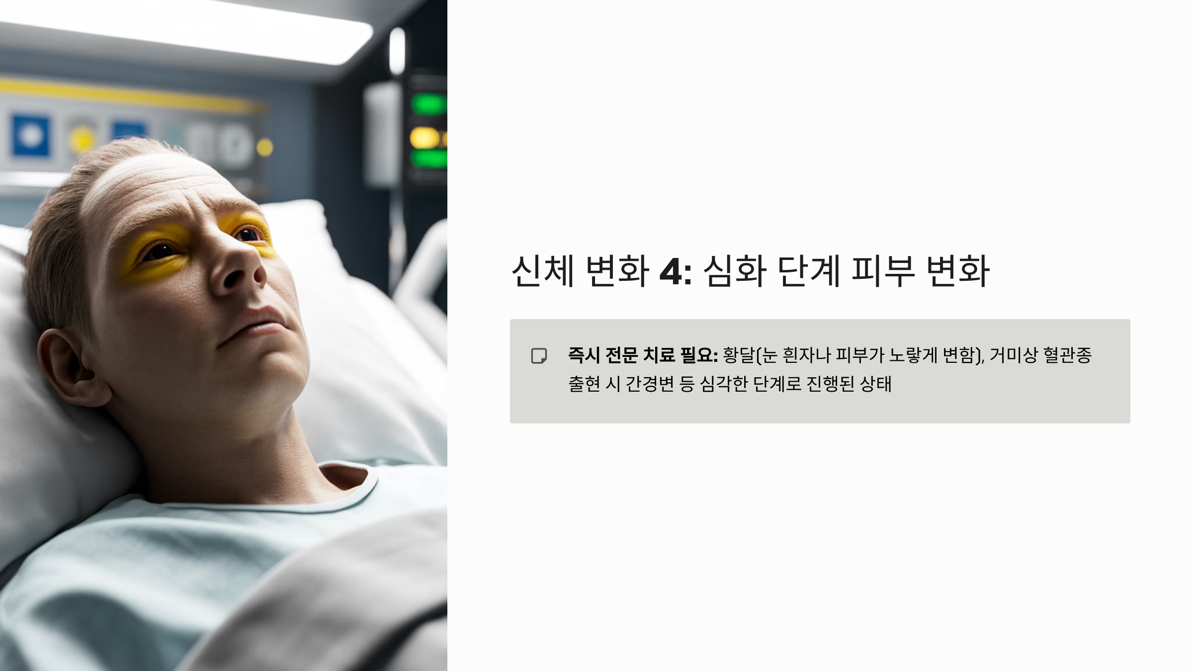- 피부 변화 (심화 단계): 지방간이 간경변 등 심각한 단계로 발전하면, 황달(눈 흰자나 피부가 노랗게 변함)이 나타나거나, 거미상 혈관종(Spider Angioma)이 피부에 나타날 수 있습니다. 이러한 증상은 즉시 전문적인 치료가 필요함을 의미합니다.