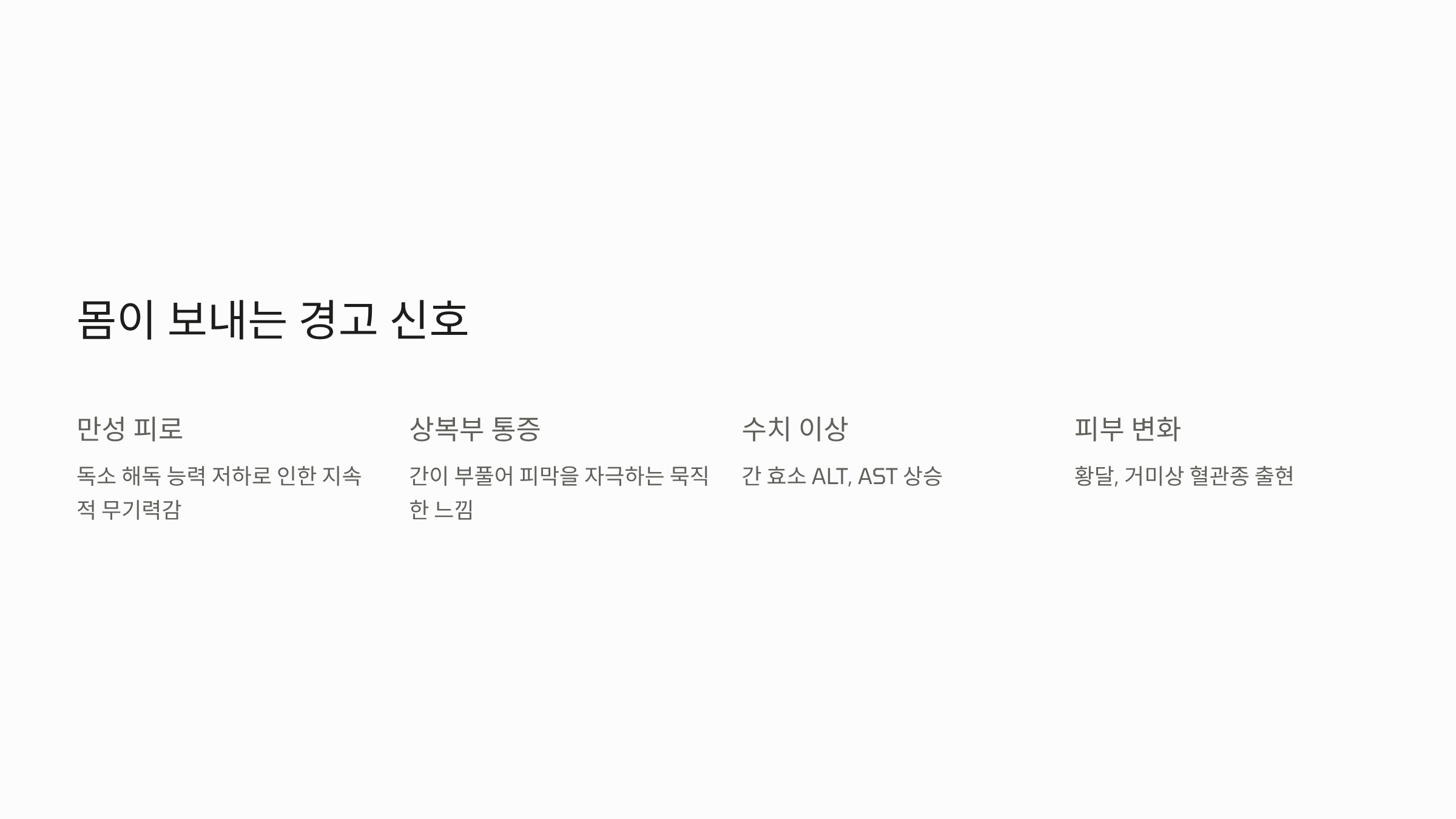 지방간이 간염이나 섬유화 단계로 진행될 때 나타날 수 있는 4가지의 외부적, 내부적 변화 신호입니다.