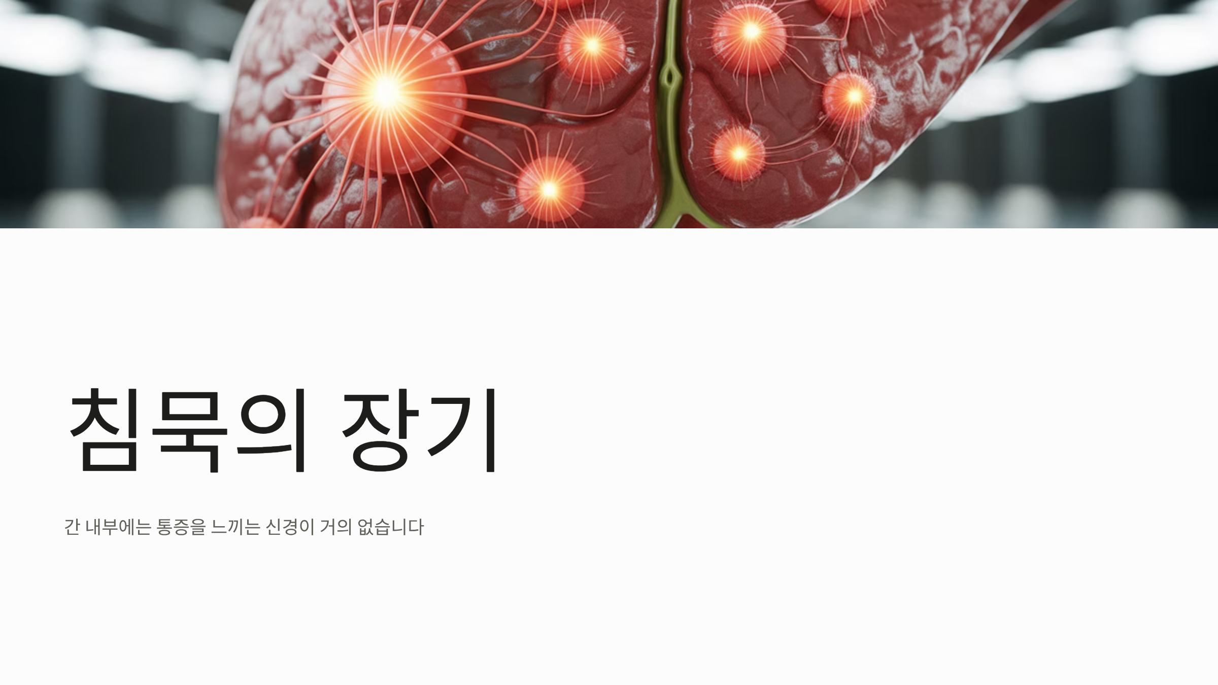 - 침묵의 장기: 간은 통증을 느끼는 신경 세포가 표면(피막)에만 있고 내부에는 거의 없습니다. 따라서 간세포에 지방이 쌓여 간이 붓기 전까지는 통증을 느끼기 어렵습니다.