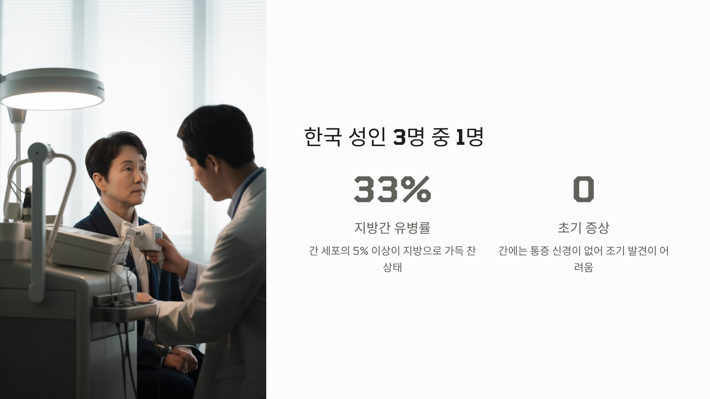 지방간은 '침묵의 장기'라 불리는 간의 특성 때문에 초기 증상이 거의 없습니다. 이 때문에 질환의 위험성이 높아집니다.
