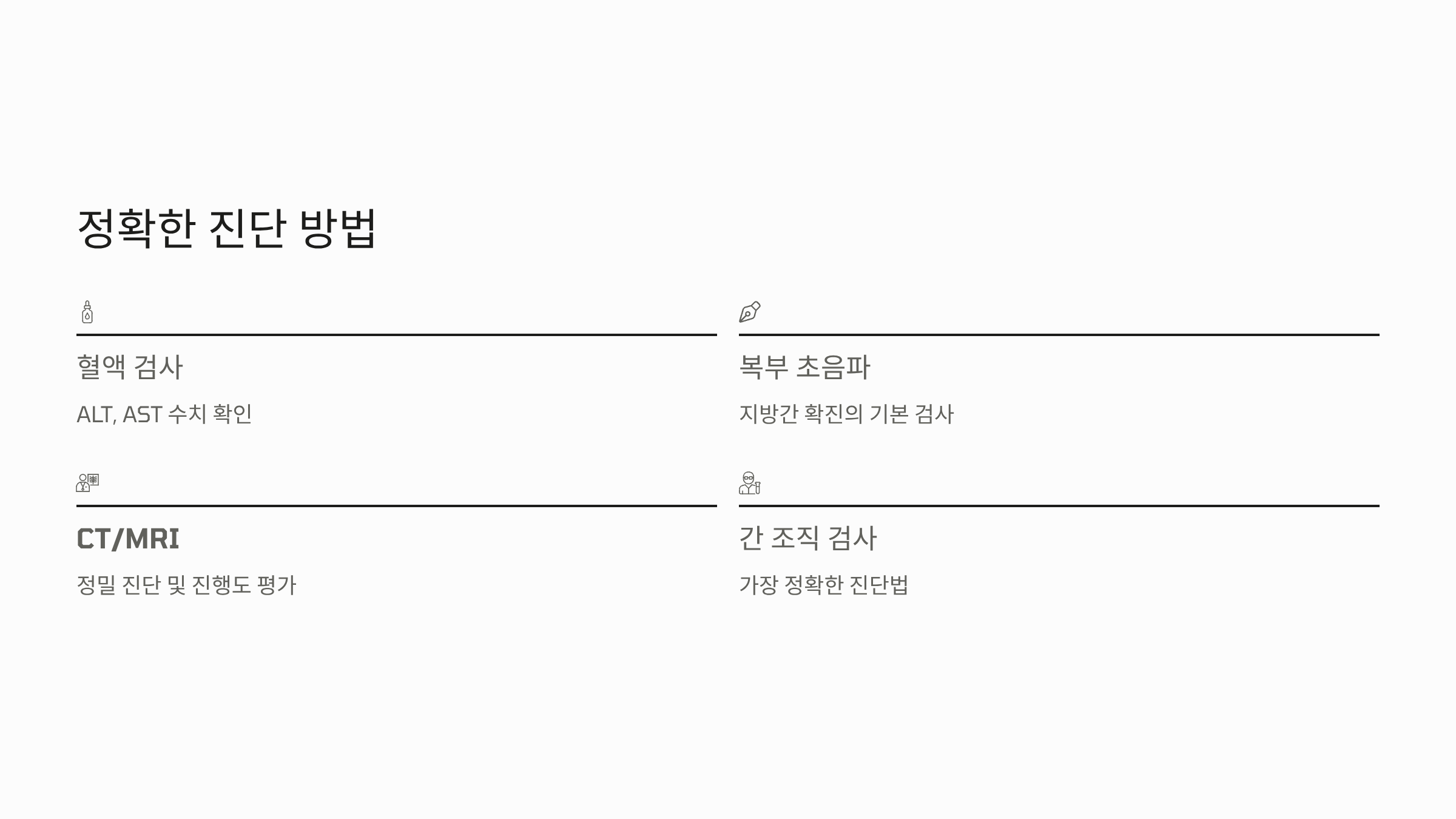 지방간 증상을 자가 진단하는 것만으로는 불충분합니다. 정확한 확진을 위해서는 병원 검사가 필수입니다.