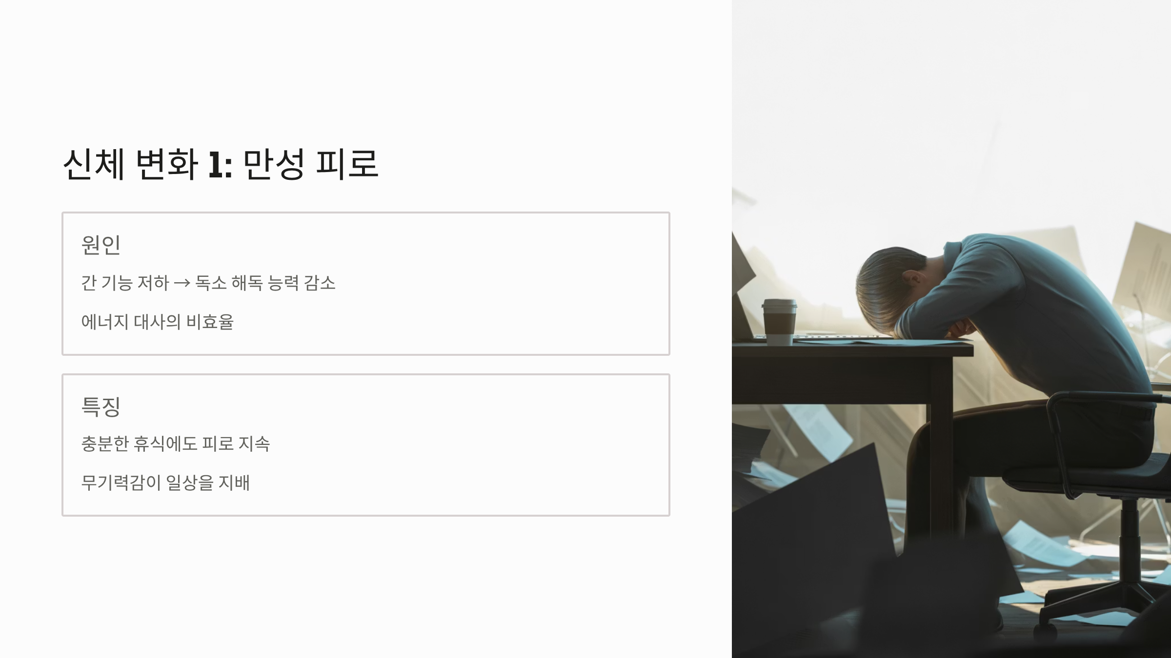 - 만성 피로 및 무기력: 간 기능이 저하되면 독소 해독 능력이 떨어지고 에너지 대사가 비효율적으로 이루어집니다. 충분히 쉬어도 피로감이 해소되지 않고 무기력감이 지속되는 것이 가장 흔한 지방간 증상입니다.