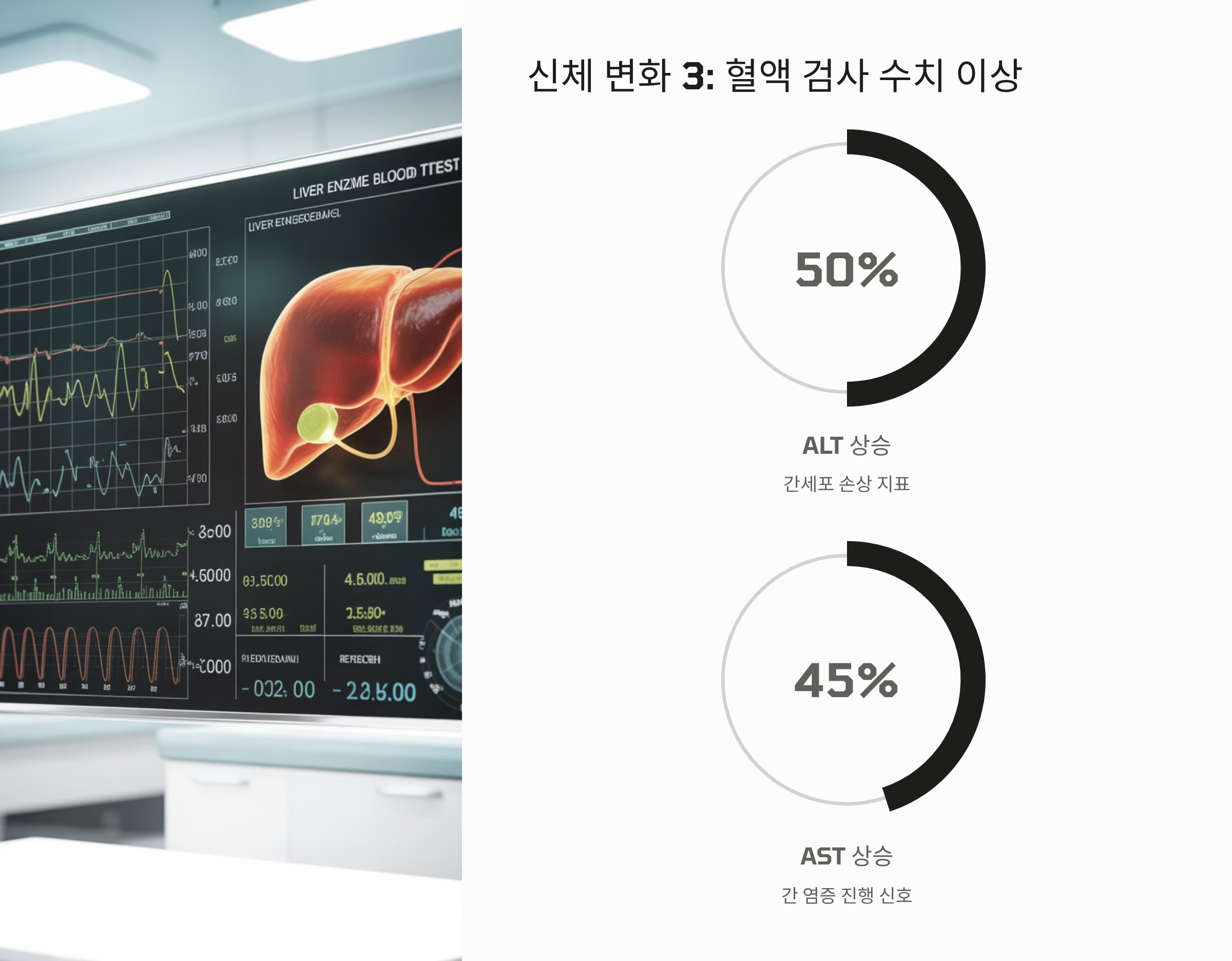 - 혈액 검사 (간 수치): 혈액 검사를 통해 간 손상 지표인 ALT(GPT)와 AST(GOT) 수치를 확인합니다. 이 수치가 정상보다 높다면 간세포 손상 및 염증을 의심할 수 있습니다.