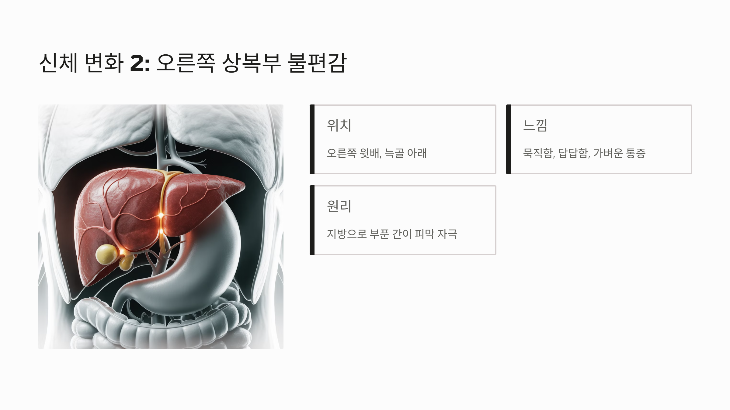- 오른쪽 상복부 통증/불쾌감: 간이 지방으로 인해 부풀어 오르면서 간을 둘러싼 피막을 자극하게 됩니다. 이로 인해 오른쪽 윗배에 묵직하거나 답답한 느낌, 혹은 가벼운 통증이 느껴질 수 있습니다.