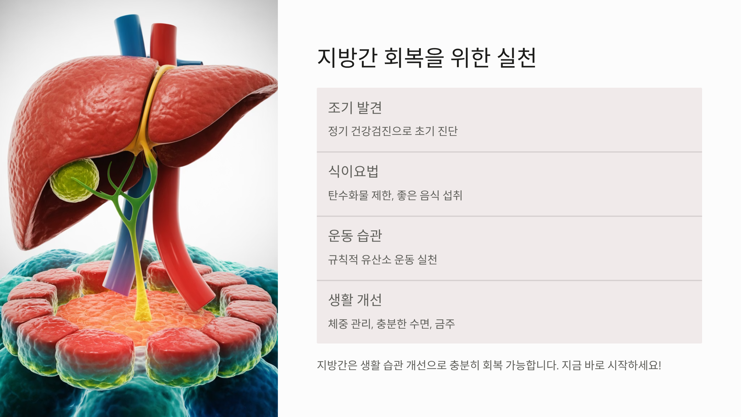지방간은 간 세포의 5% 이상이 지방으로 축적된 상태를 의미하며, 식습관 개선을 통해 충분히 회복 가능한 질환입니다. 간 기능 회복을 위해서는 간 해독을 돕고 지방 분해를 촉진하는 음식 섭취