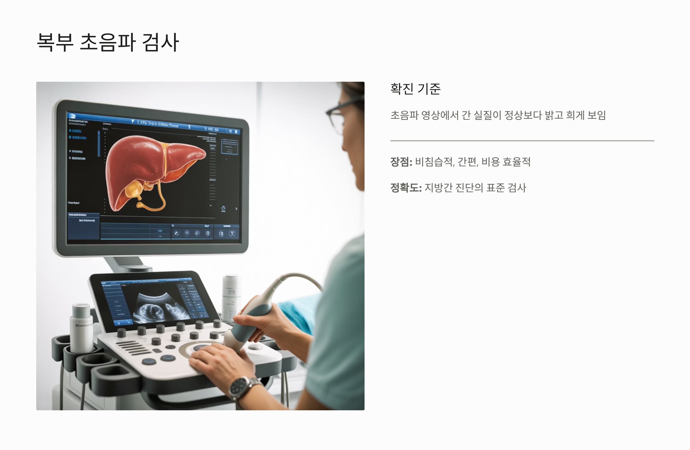 - 복부 초음파 검사: 지방간을 확진하는 가장 일반적이고 중요한 검사입니다. 초음파 영상에서 간 실질이 정상 간보다 밝고 희게 보이면 지방간으로 진단됩니다.