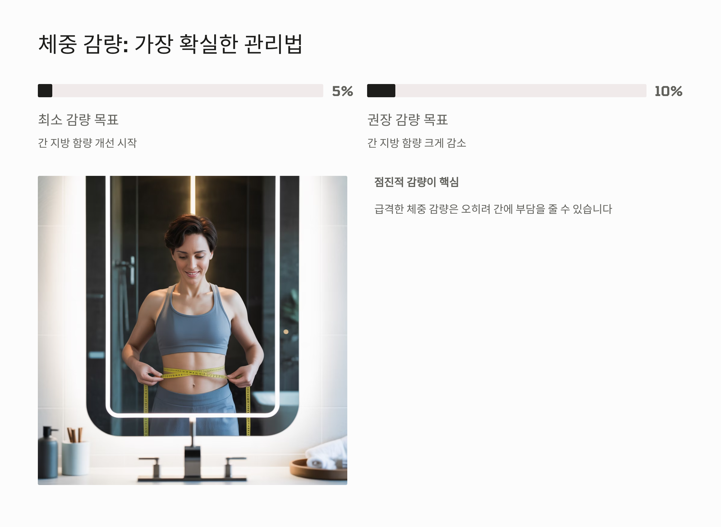 - 체중 감량 (가장 확실한 관리법): 비알코올성 지방간 환자는 현재 체중의 5%~10%를 감량하는 것만으로도 간의 지방 함량이 크게 감소합니다. 주당 0.5kg 정도의 점진적인 감량을 목표로 해야 합니다.
