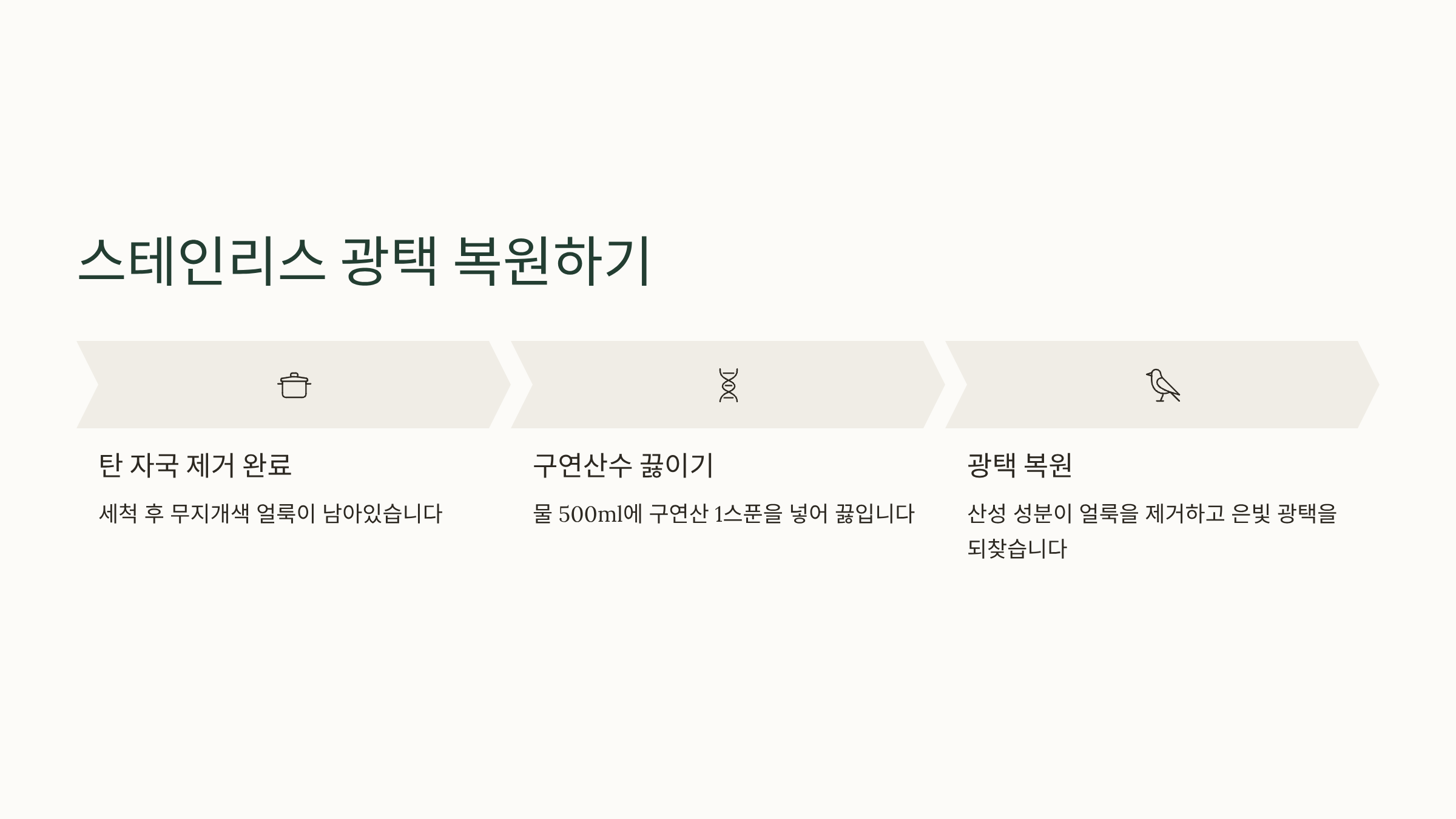 - 스테인리스 광택 복원: 탄 자국을 완전히 제거한 후 냄비에 무지개색 얼룩(열로 인한 산화 흔적)이 남았다면, 구연산수(물 500ml에 구연산 1스푼)를 넣어 끓여줍니다. 구연산의 산성 성분이 스테인리스의 표면을 다시 깨끗하게 정돈하여 얼룩을 제거하고 원래의 은빛 광택을 되찾아줍니다.