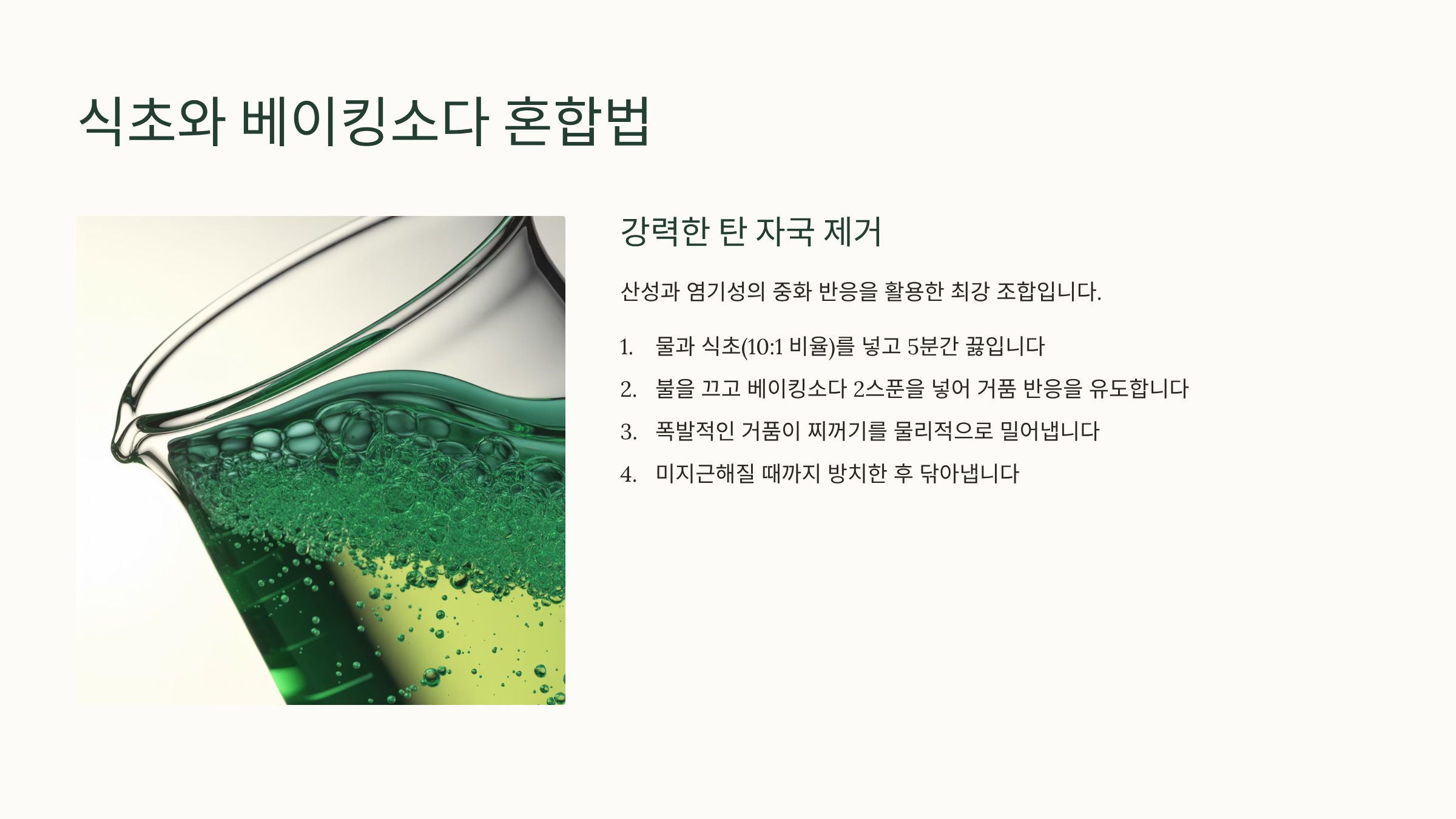 2) 식초와 베이킹소다 혼합법 (강력한 탄 자국, 중화 반응 활용)