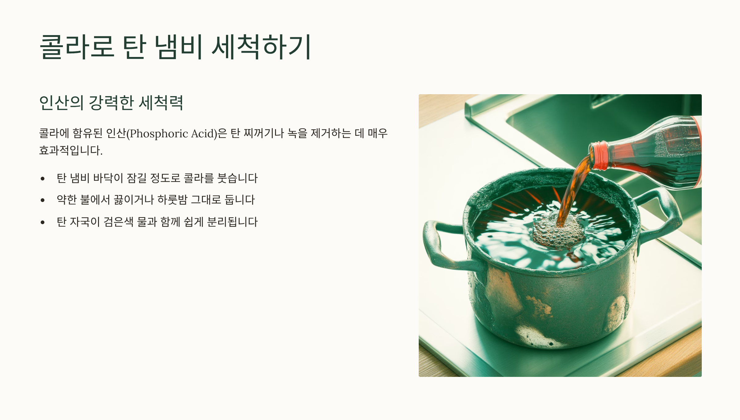 - 콜라 또는 탄산수: 콜라에 함유된 인산(Phosphoric Acid)은 탄 찌꺼기나 녹을 제거하는 데 매우 효과적인 산성 성분입니다. 탄 냄비 바닥이 잠길 정도로 콜라를 붓고 약한 불에서 끓이거나, 혹은 하룻밤 그대로 두었다가 닦아내면 탄 자국이 검은색 물과 함께 쉽게 분리됩니다.