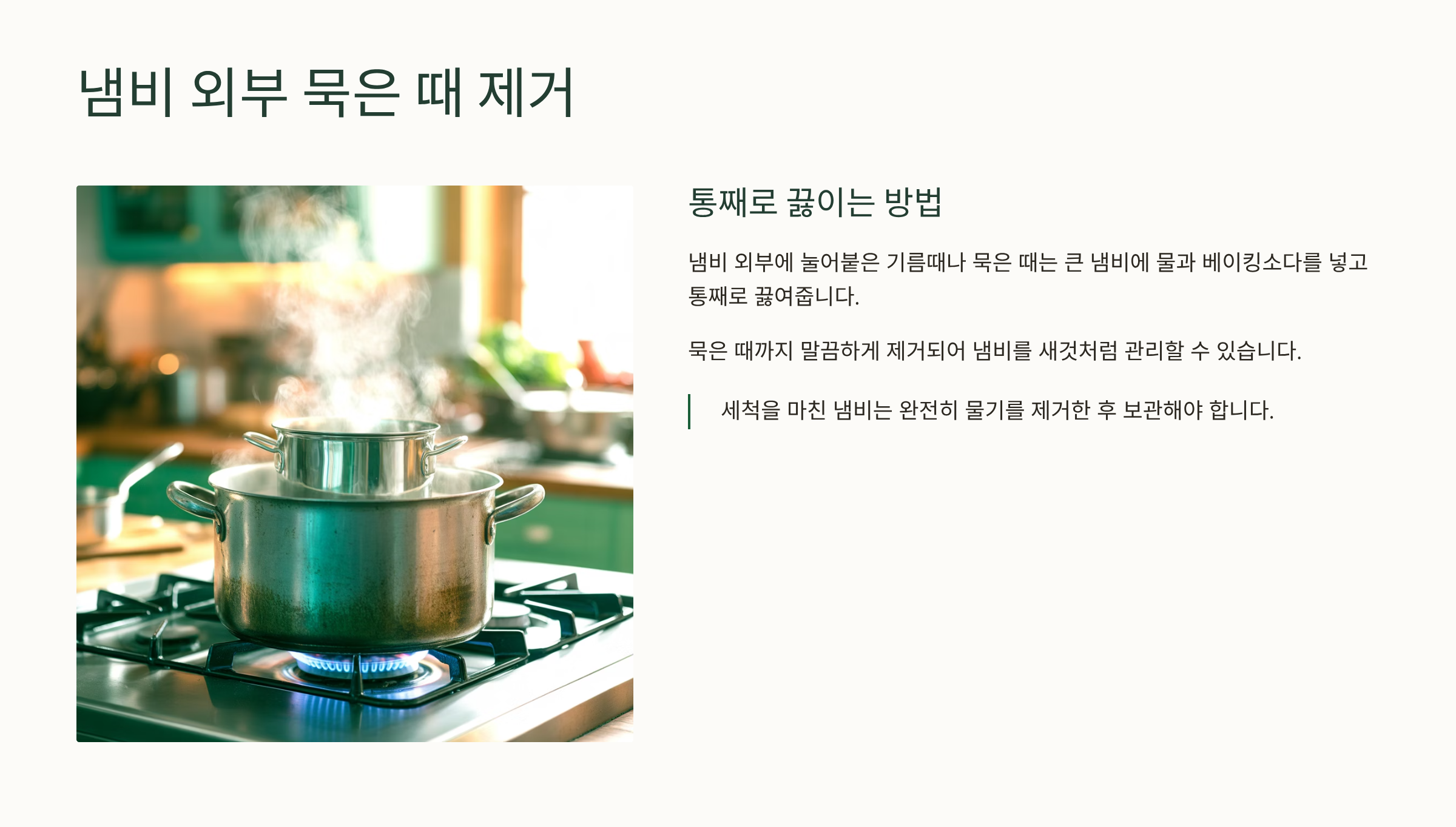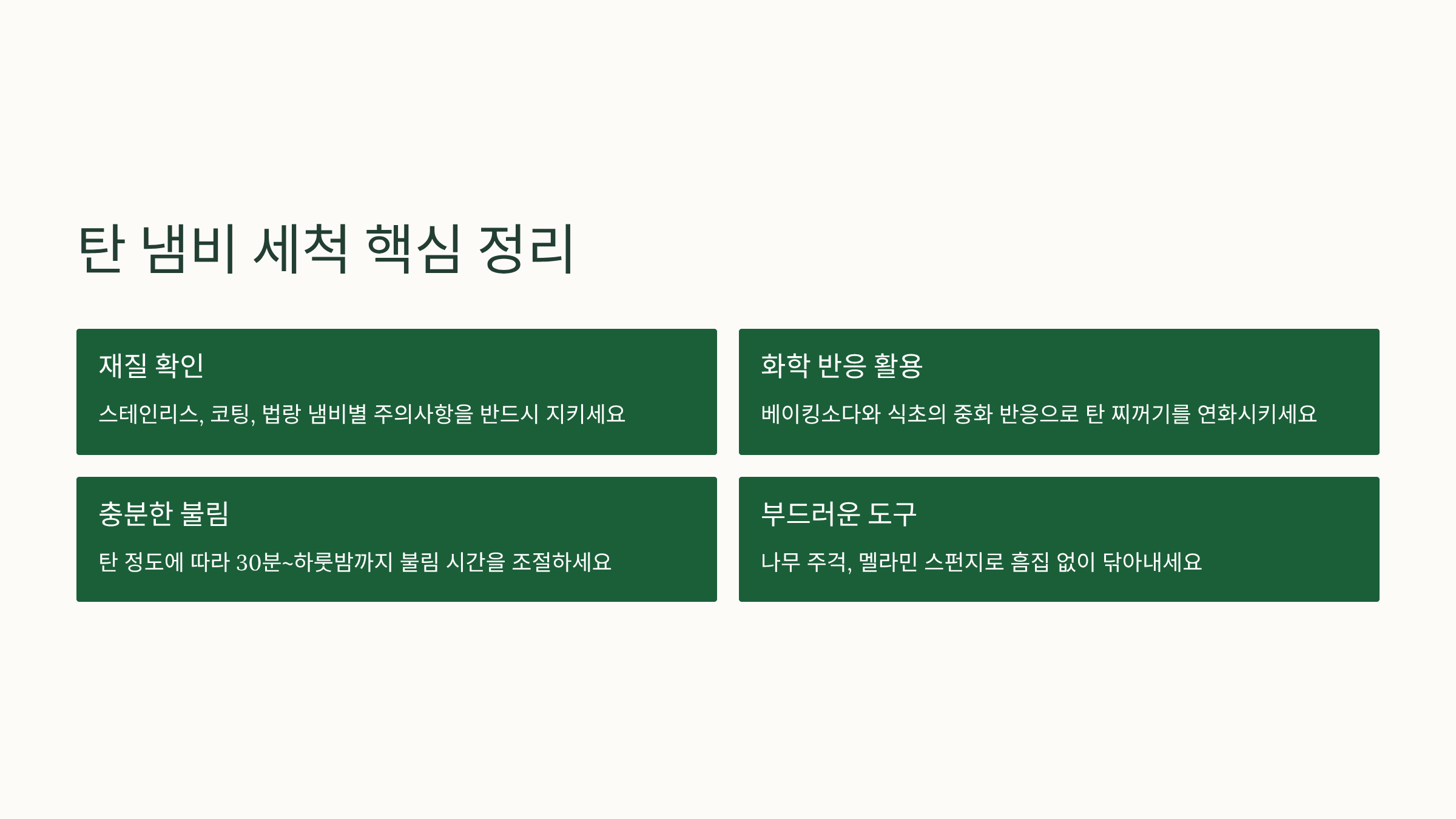 냄비의 종류(스테인리스, 코팅 등)에 따른 세척 주의사항부터 시작해, 베이킹소다와 식초를 이용한 천연 세척 공식, 탄 자국의 농도에 따라 시간을 조절하는 불림 기술, 그리고 주방에 있는 의외의 재료를 활용하는 팁까지 모두 담았습니다. 탄 냄비를 깔끔하게 닦아내고 광택까지 되살리는 마무리 노하우로 주방을 빛내보세요.
