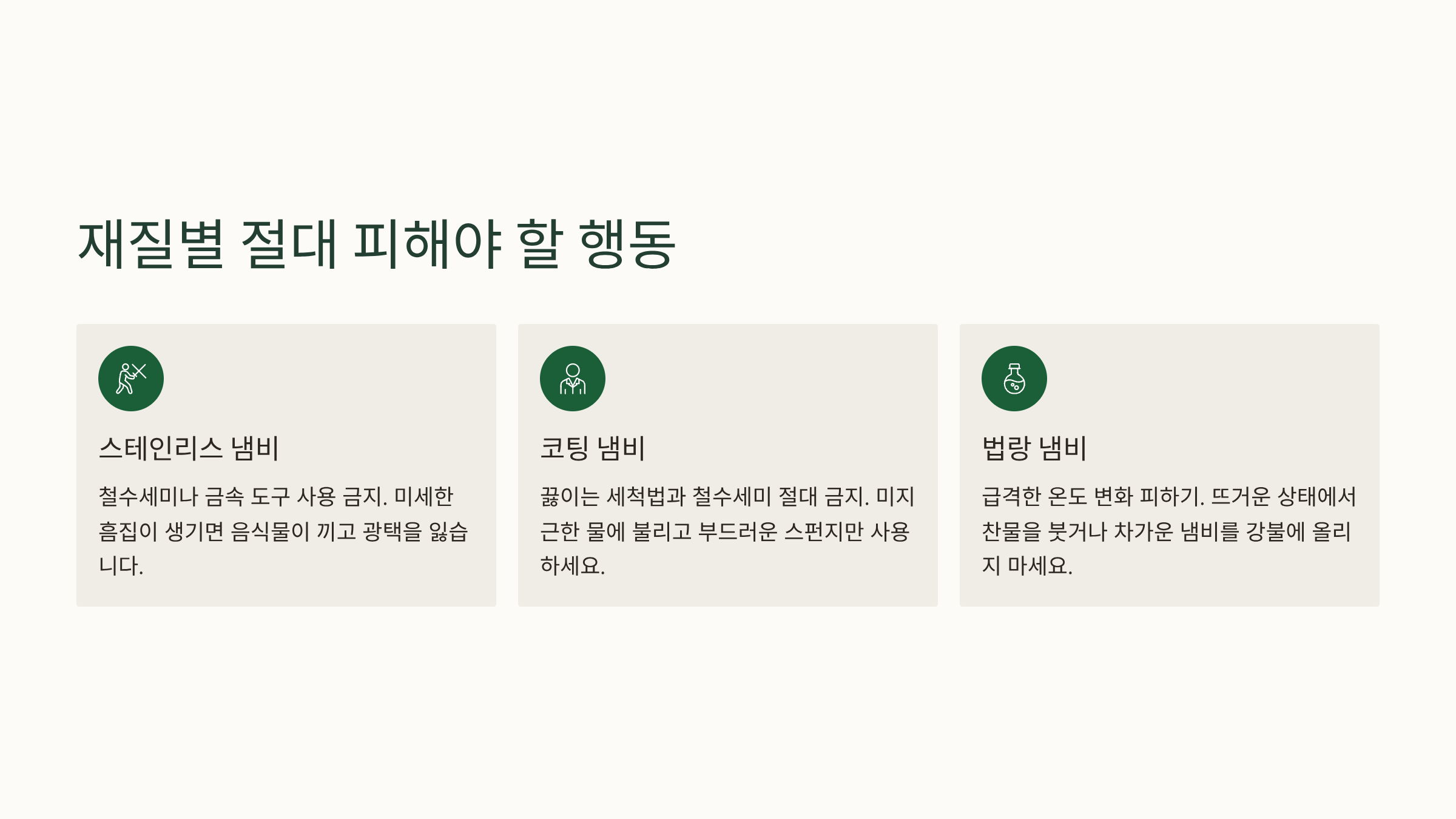 - 코팅(테프론) 냄비: 절대로 끓이는 세척법이나 철수세미를 사용해서는 안 됩니다. 고열과 강한 마찰은 코팅층을 빠르게 손상시켜 벗겨지게 만들고, 이는 냄비 수명 단축을 넘어 안전상의 문제를 일으킵니다. 코팅 냄비는 미지근한 물에 불리고 부드러운 스펀지로만 닦아야 합니다.
