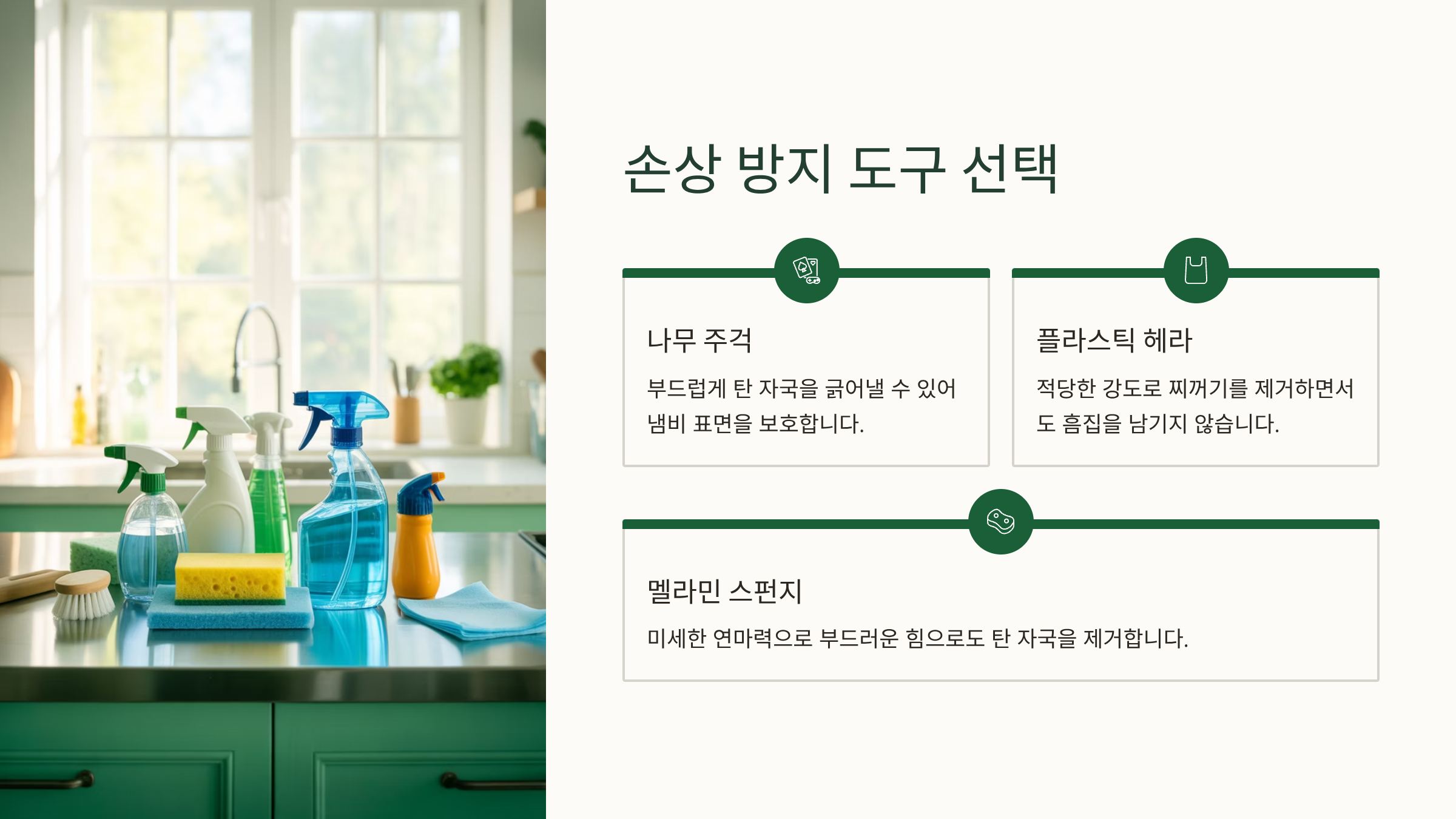 - 손상 방지 도구 활용: 탄 자국을 긁어낼 때 철수세미 대신 나무 주걱, 플라스틱 헤라 또는 멜라민 스펀지를 활용합니다. 멜라민 스펀지는 미세한 연마력이 있어 부드러운 힘으로도 탄 자국을 제거하는 데 탁월하며 냄비 표면에 큰 흠집을 남기지 않습니다.