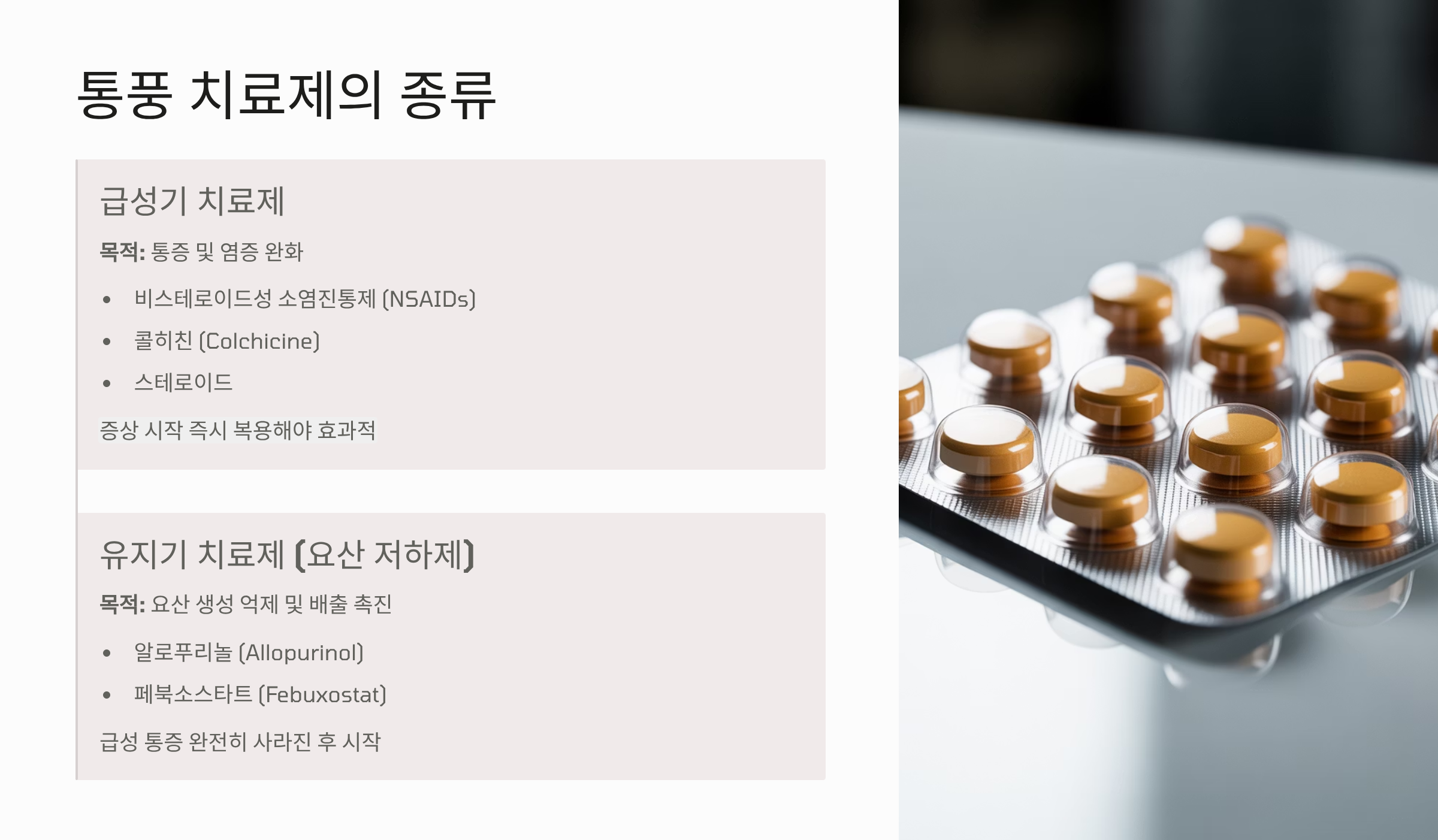 통풍 치료제는 증상 시기에 따라 사용하는 약물의 종류와 목적이 완전히 다릅니다. 이를 혼동하여 복용하면 오히려 증상을 악화시킬 수 있습니다.