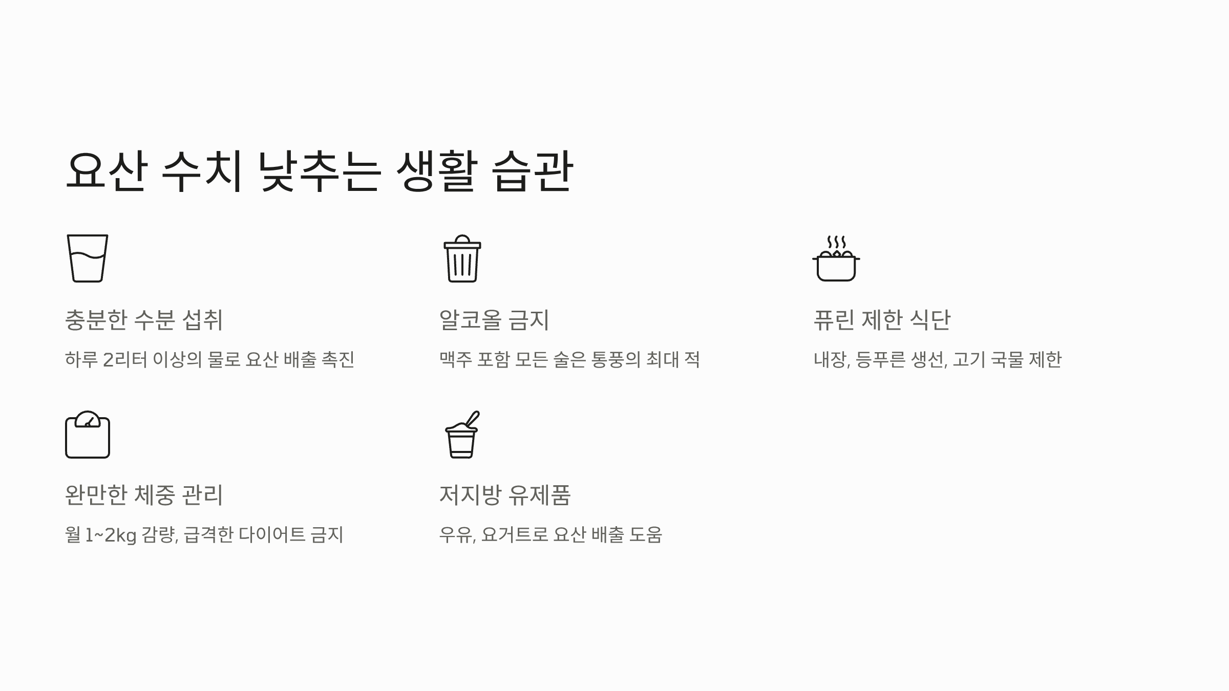 수분 섭취 (가장 중요): 하루 2리터 이상의 물을 마셔야 합니다. 충분한 수분은 혈액 내 요산 농도를 희석시키고 소변을 통해 요산이 원활하게 배출되도록 돕습니다. 맹물을 마시기 힘들다면 이뇨 작용이 없는 보리차 등을 활용하는 것도 좋습니다.