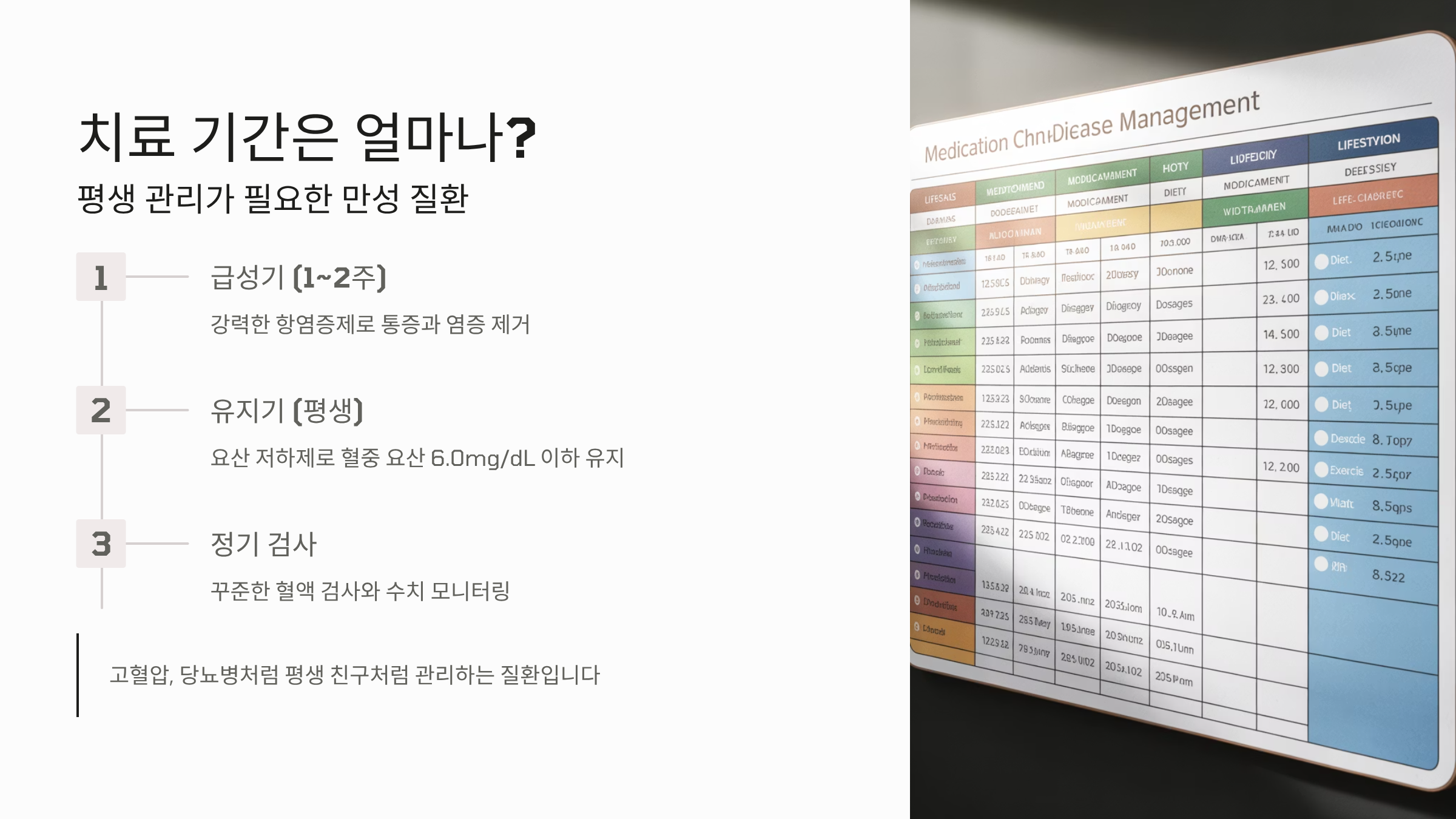 많은 분들이 통풍 약을 며칠 먹고 통증이 사라지면 치료가 끝났다고 생각합니다. 하지만 통풍 치료법의 목표는 통증 제거가 아닌 요산 수치 정상화와 유지에 있습니다. 따라서 통풍 치료기간은 사실상 평생이라고 보아야 합니다. 고혈압이나 당뇨병처럼 관리하는 만성 질환의 개념으로 접근해야 합니다.