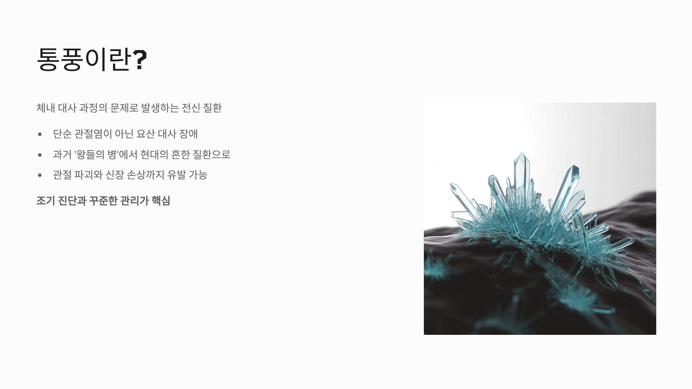 어느 날 밤, 갑작스럽게 엄지발가락이나 발목이 불에 타는 듯 뜨겁고, 이불깃만 스쳐도 비명이 나올 정도의 극심한 통증을 경험했다면 통풍을 강력하게 의심해야 합니다. 통풍은 과거에는 왕들이 걸리는 병이라 불렸지만, 서구화된 식습관과 음주 문화로 인해 이제는 연령을 불문하고 누구에게나 찾아올 수 있는 흔한 질환이 되었습니다. 많은 분들이 통증이 사라지면 병이 나았다고 착각하여 치료를 중단하지만, 이는 더 큰 재앙의 시작일 뿐입니다. 통풍은 관절을 파괴하고 신장까지 망가뜨릴 수 있는 무서운 질환이므로 정확한 진단과 꾸준한 관리가 필수적입니다.
