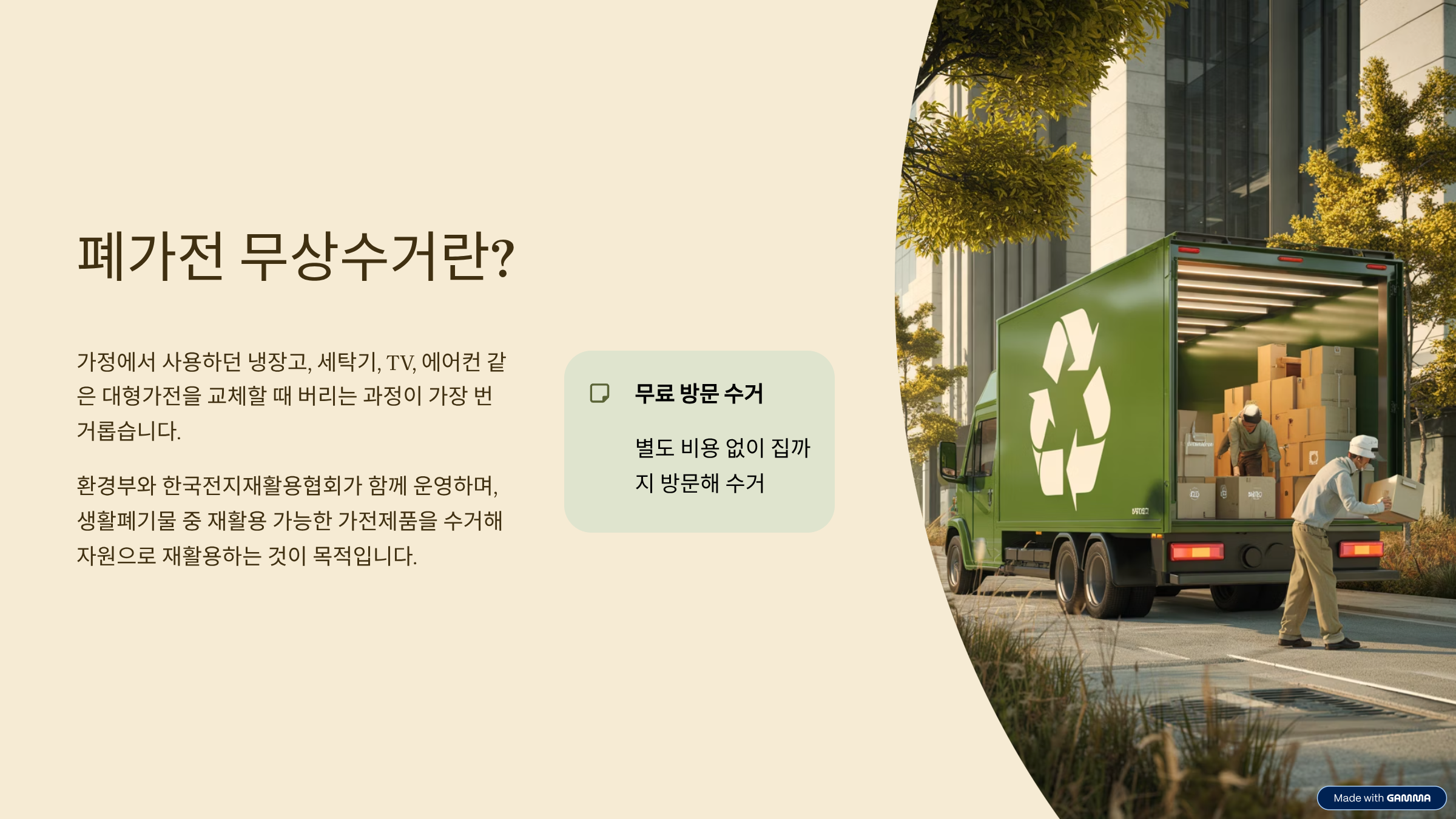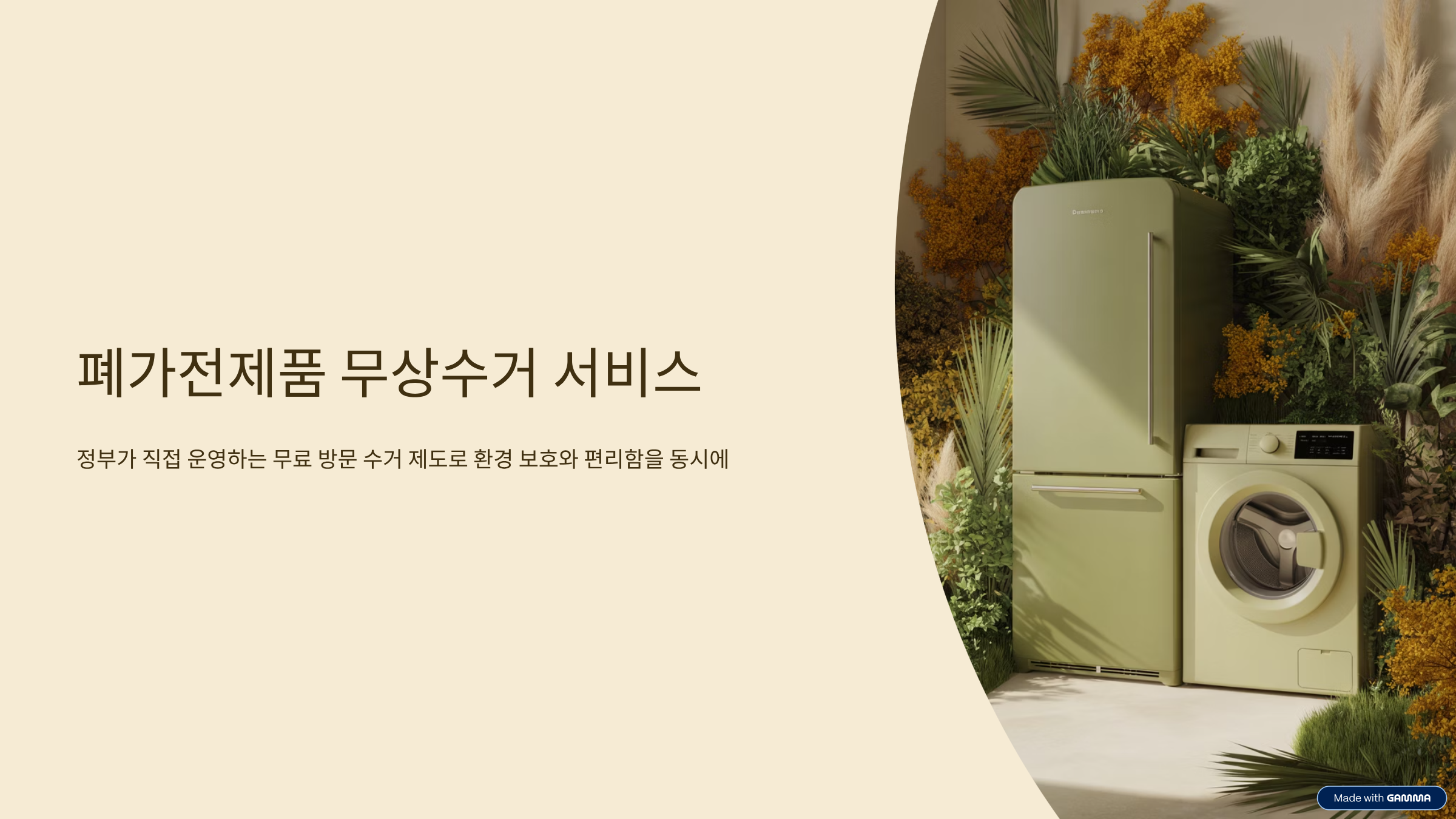 - 폐가전제품 무상수거 서비스는 정부가 직접 운영하는 무료 제도
