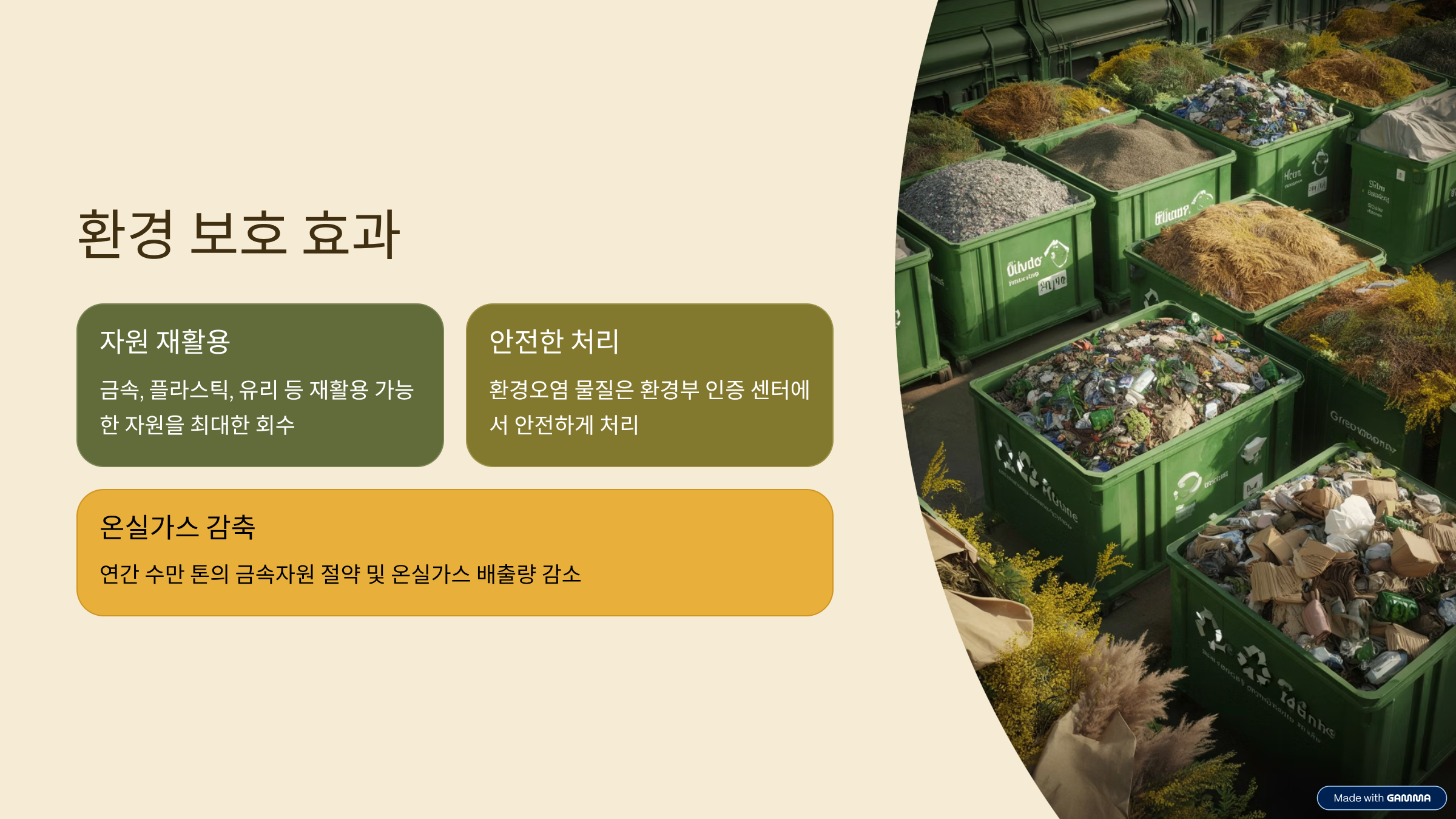 이 과정에서 금속, 플라스틱, 유리 등 재활용 가능한 자원을 최대한 회수하고