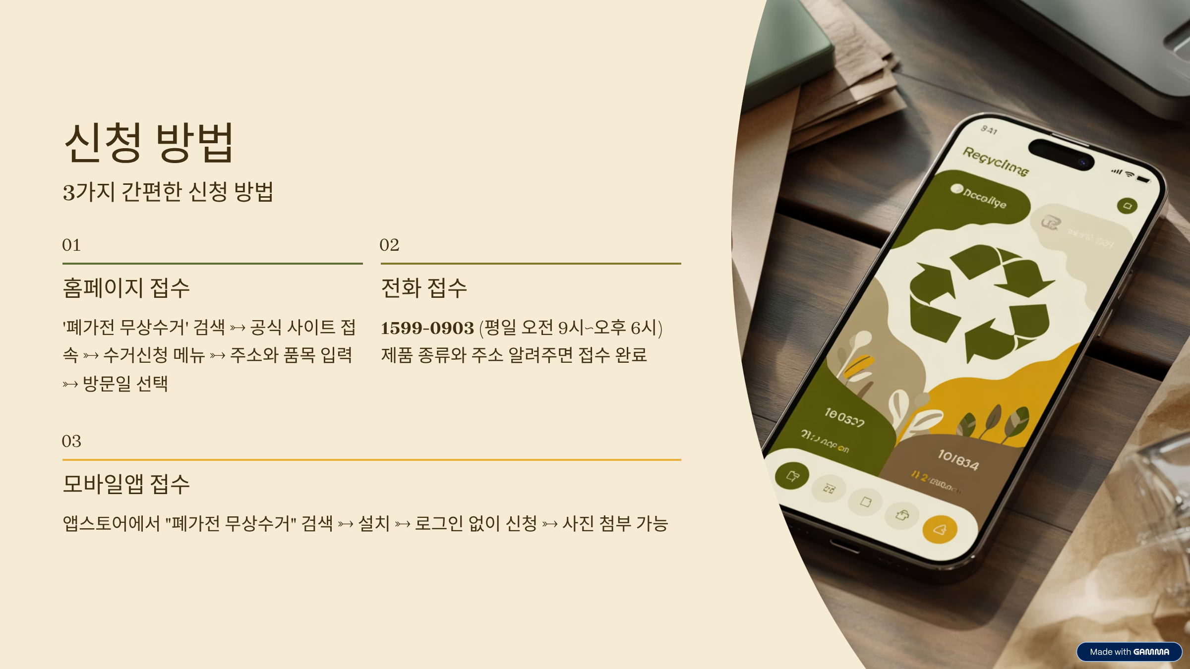 무상수거 서비스는 전화, 인터넷, 모바일앱 3가지 방법으로 간편하게 신청할 수 있습니다.