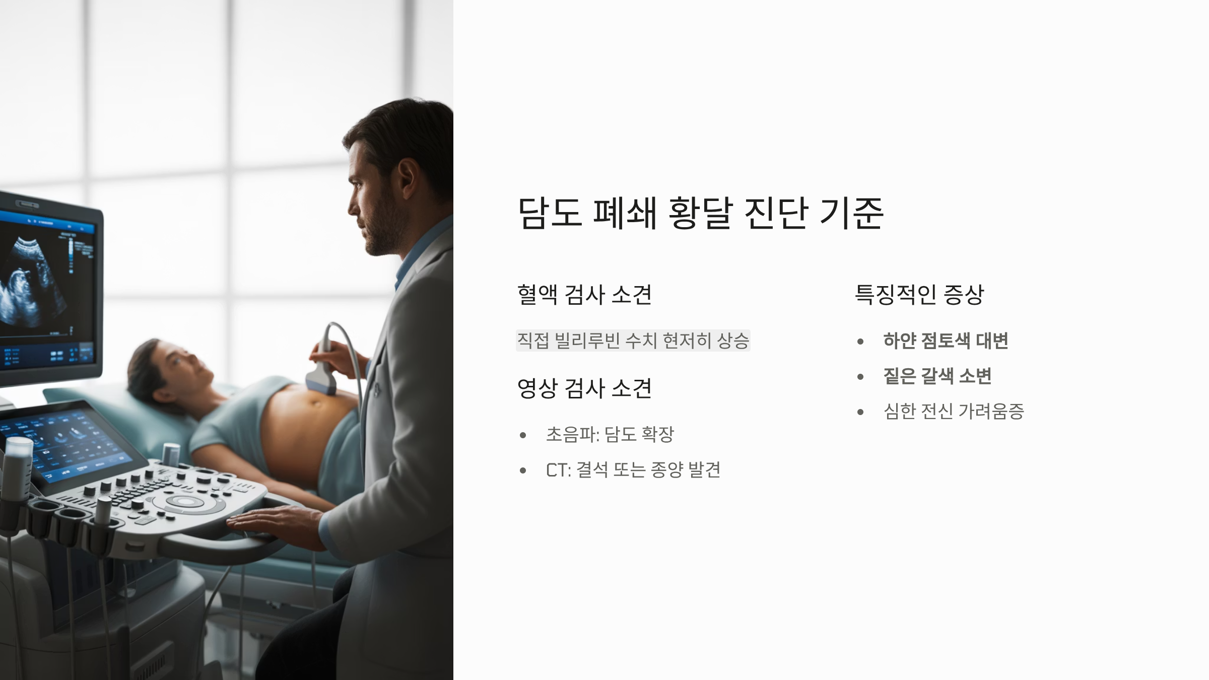 - 진단 기준: 혈액 검사 시 주로 간에서 처리된 후의 빌리루빈인 '직접 빌리루빈' 수치가 현저히 높게 나타납니다. 초음파나 CT 검사 시 담도가 확장되거나 결석, 종양 등이 발견됩니다.