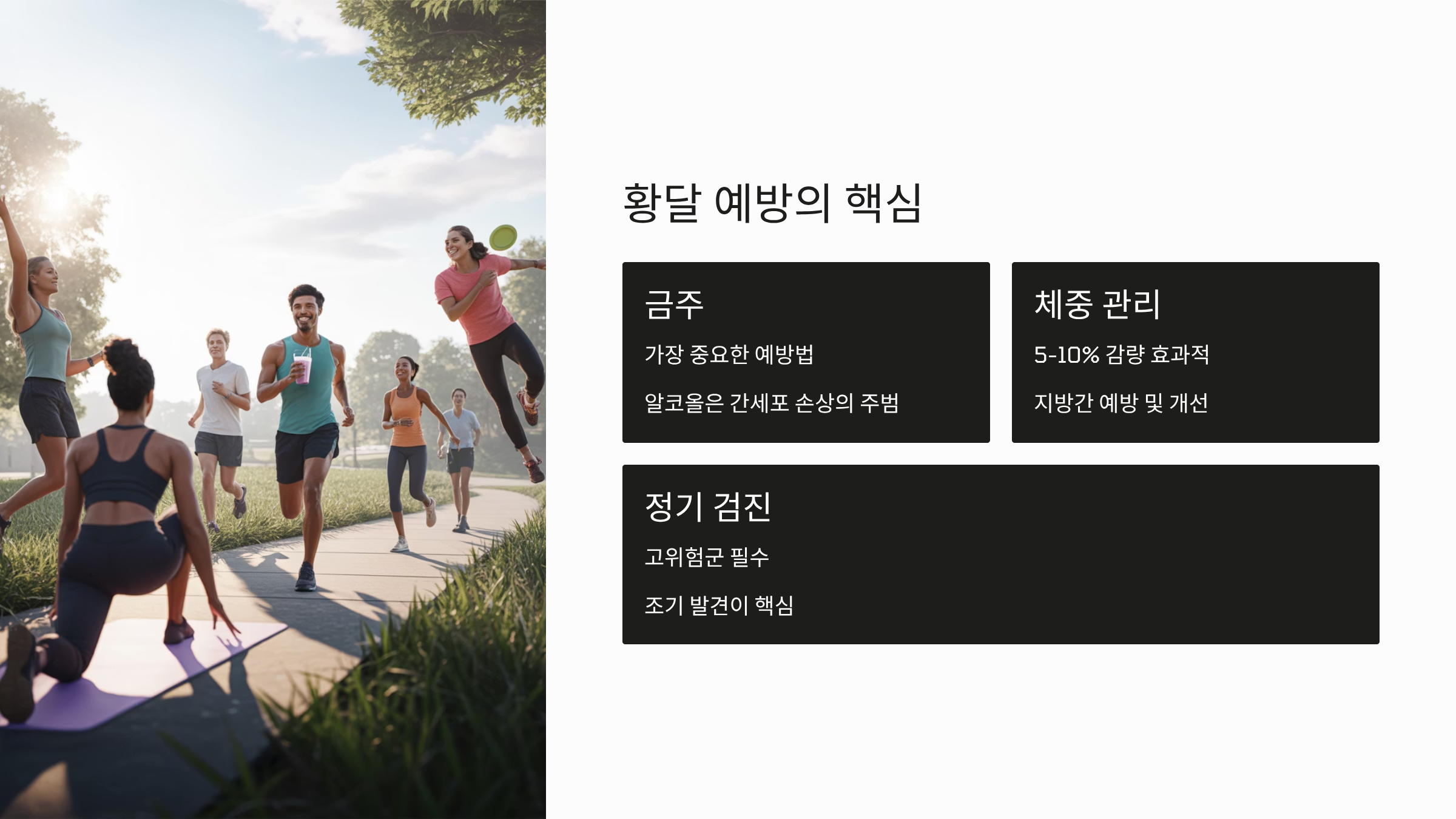 - 규칙적인 검진: 만성 간염 보균자, 비만, 당뇨병 환자 등 고위험군은 정기적인 간 기능 검사(혈액, 초음파)를 통해 황달 발생 가능성을 미리 예측하고 예방해야 합니다.