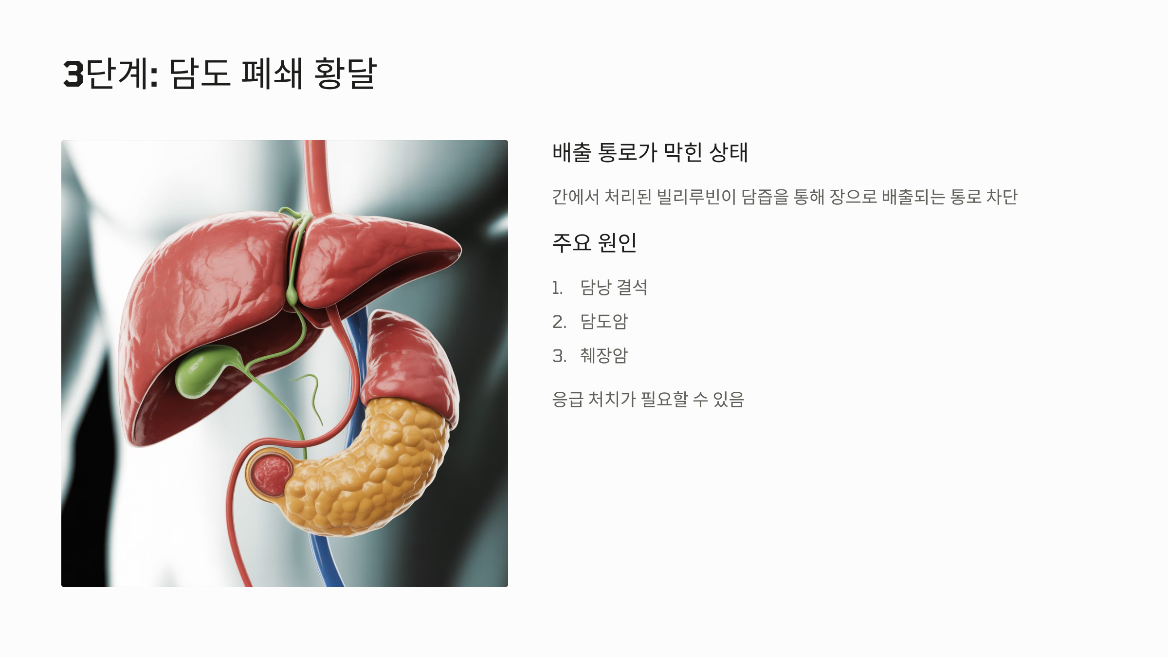 - 주요 원인: 담낭 결석, 담도암, 췌장암 등 담도 폐쇄를 유발하는 질환입니다.