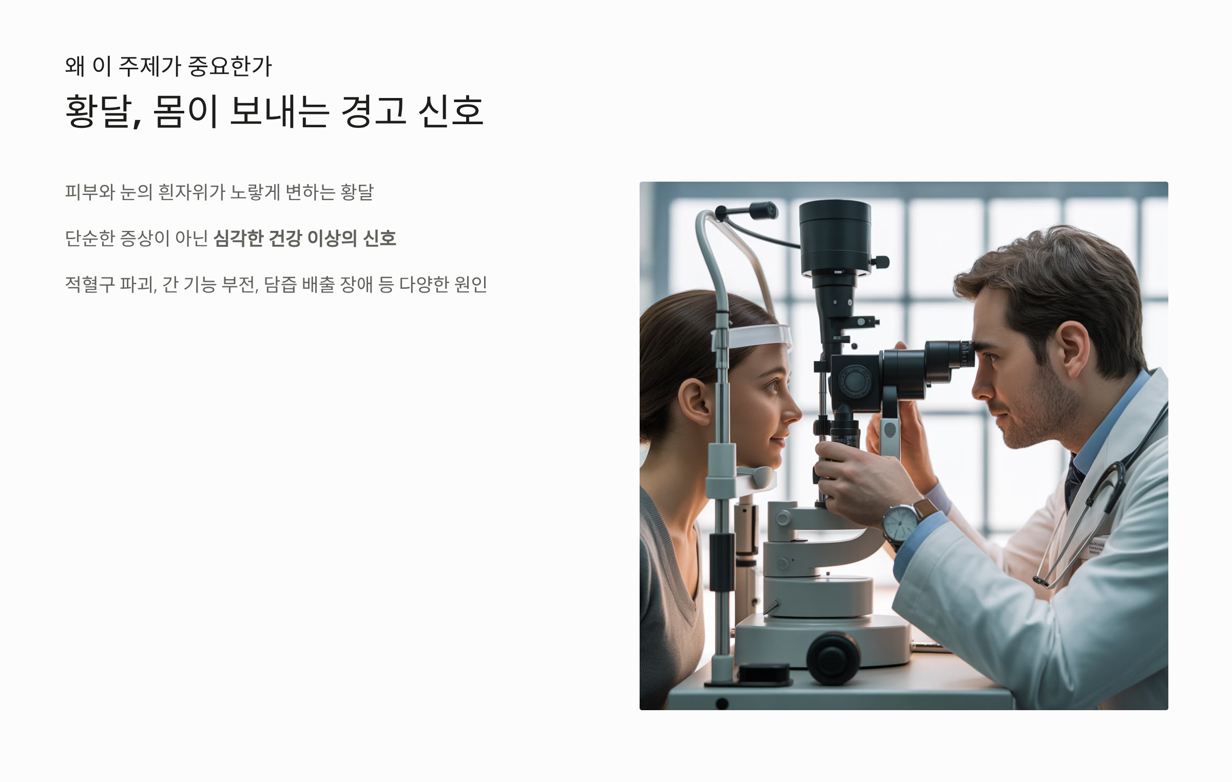 - 주요 증상: 황달 외에 극심한 피로감, 오른쪽 상복부 통증, 메스꺼움, 식욕 부진 등이 동반됩니다.
