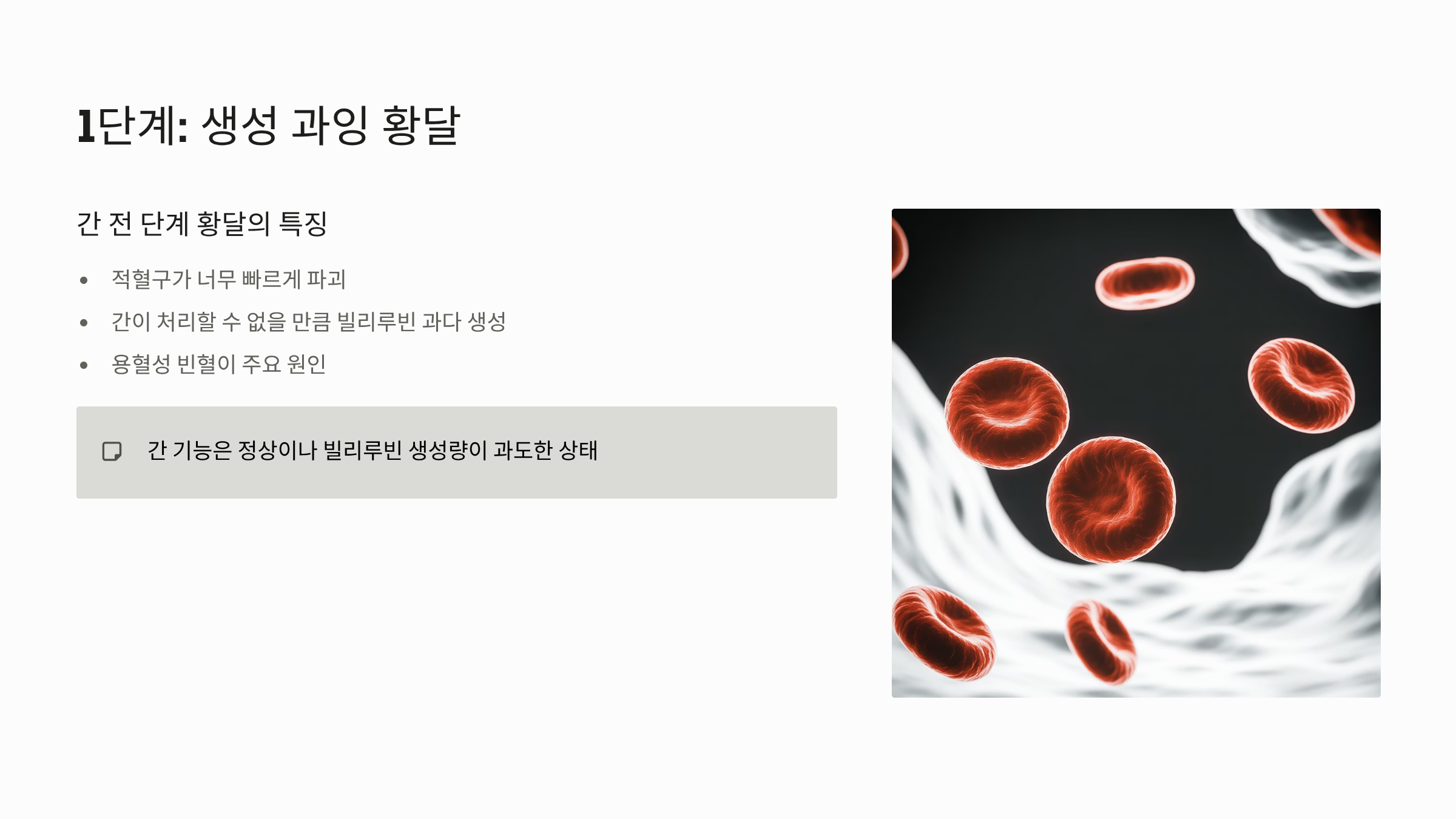 - 문제: 수명을 다한 적혈구가 너무 빠르게, 과도하게 파괴되어 간이 처리할 수 없을 만큼 빌리루빈이 많이 생성됩니다.
