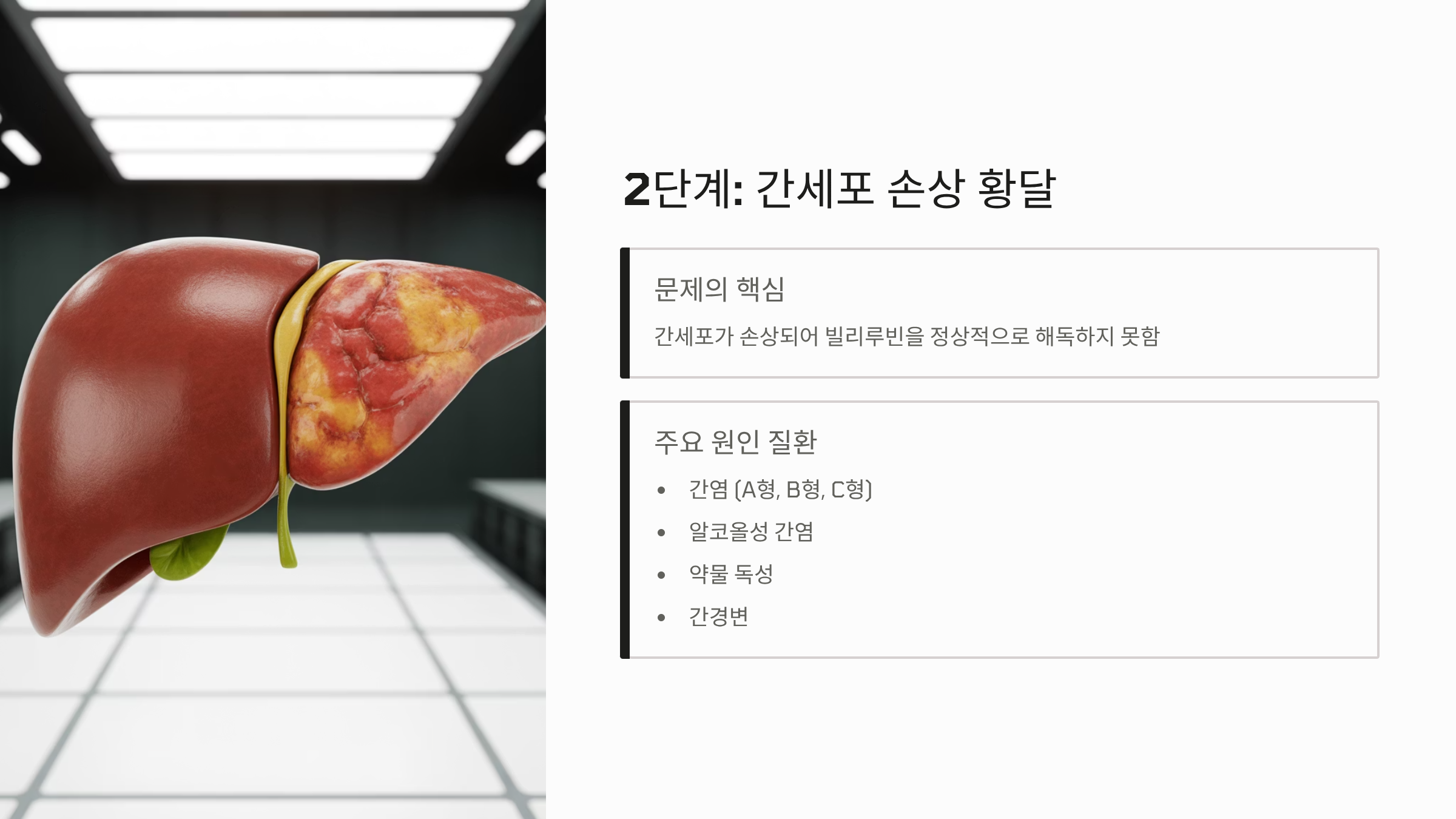- 문제: 간세포가 손상되어 빌리루빈을 정상적으로 해독(처리)하지 못합니다.