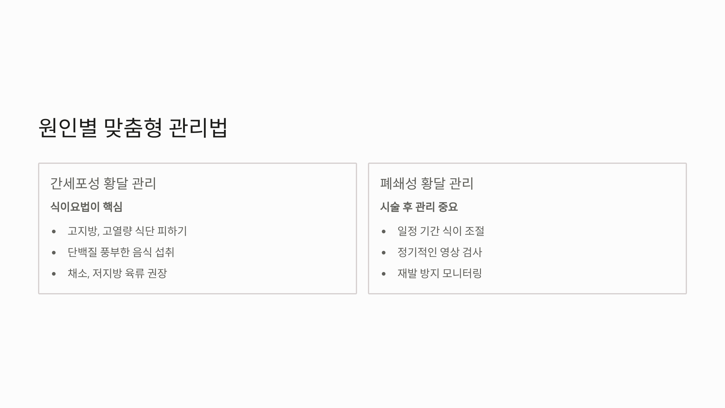 - 폐쇄성 황달 관리: 폐쇄 원인 제거 시술 후에는 담도의 회복을 위해 일정 기간 식이 조절이 필요하며, 재발 방지를 위해 정기적인 영상 검사가 중요합니다.